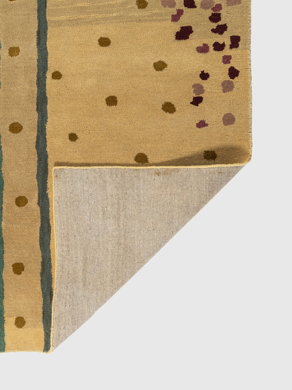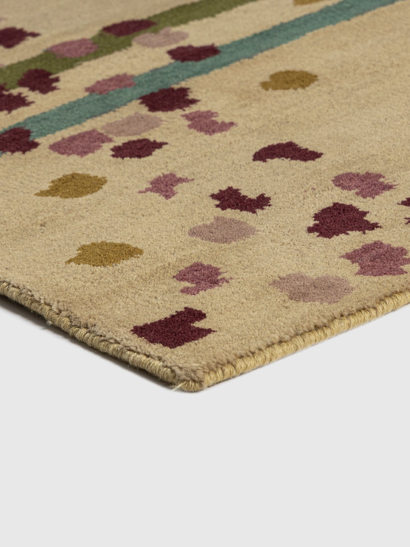 Introduce contemporary elegance to your home with the Rapley Wool Tufted Carpet. Crafted from high quality wool, this design blends structured geometry with playful dotted detailing. The warm golden base is accented with rich berry toned clusters and teal linear borders, creating a modern composition that feels artistic yet balanced.