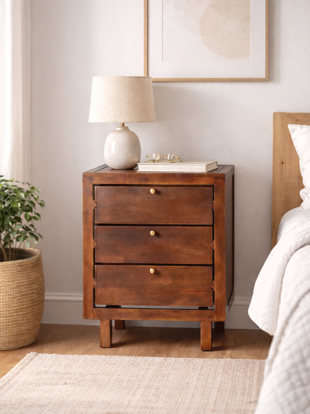 The Renao Wooden Side Table with Glass Sides is a thoughtfully designed accent piece that blends modern detail with practical storage. Crafted from solid wood, the table features a warm natural finish and a clean, compact silhouette. The transparent glass side panels add a light, contemporary touch while allowing the beauty of the wooden structure to remain visible. Spacious drawers provide convenient storage for bedside or living room essentials. Perfect beside a sofa or bed, the Renao Side Table brings functionality, elegance, and refined craftsmanship to modern interiors.