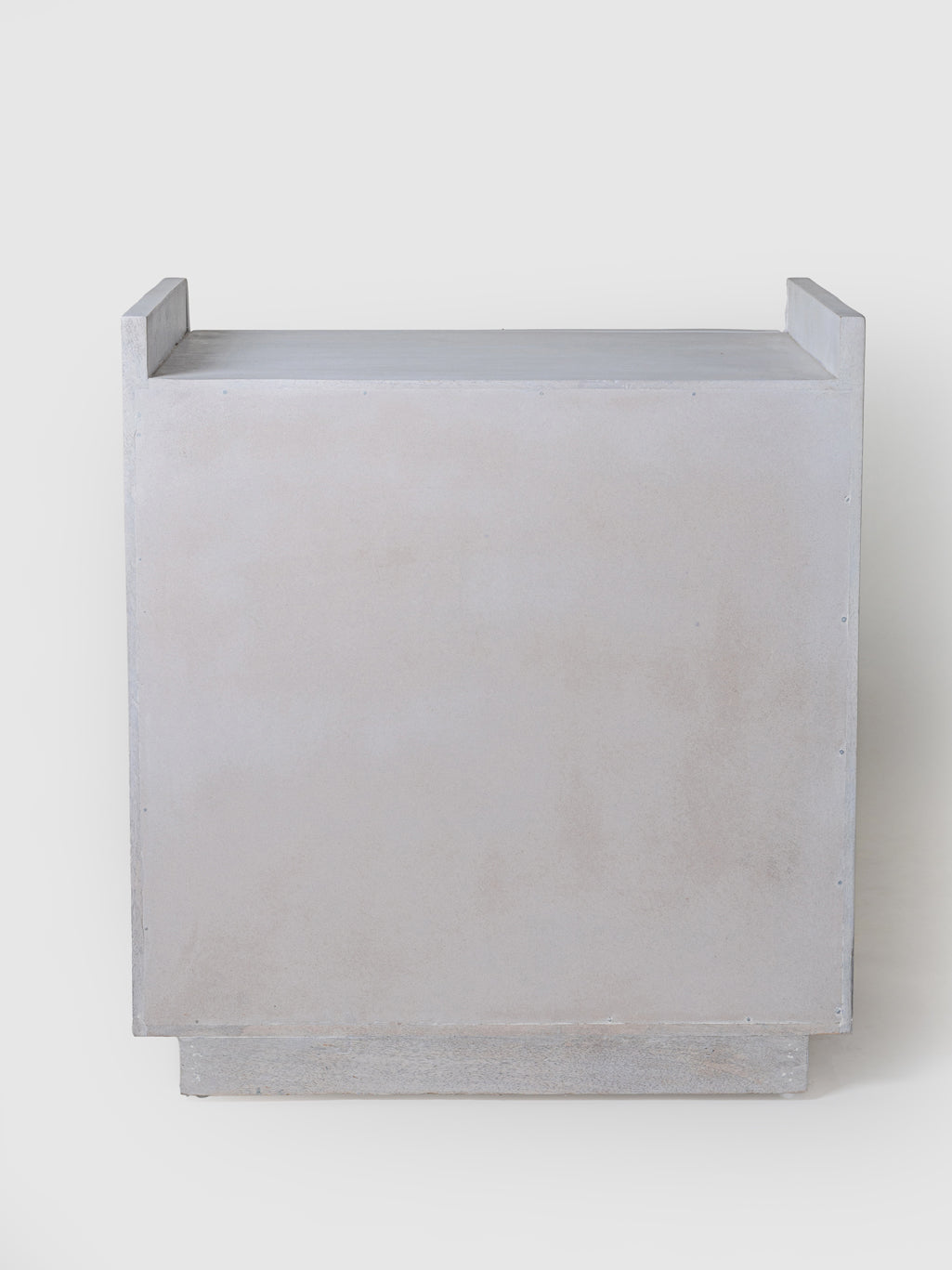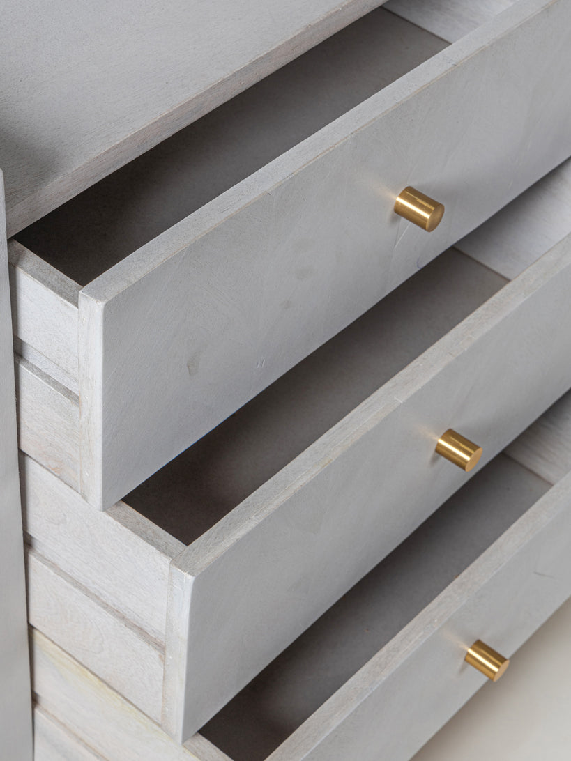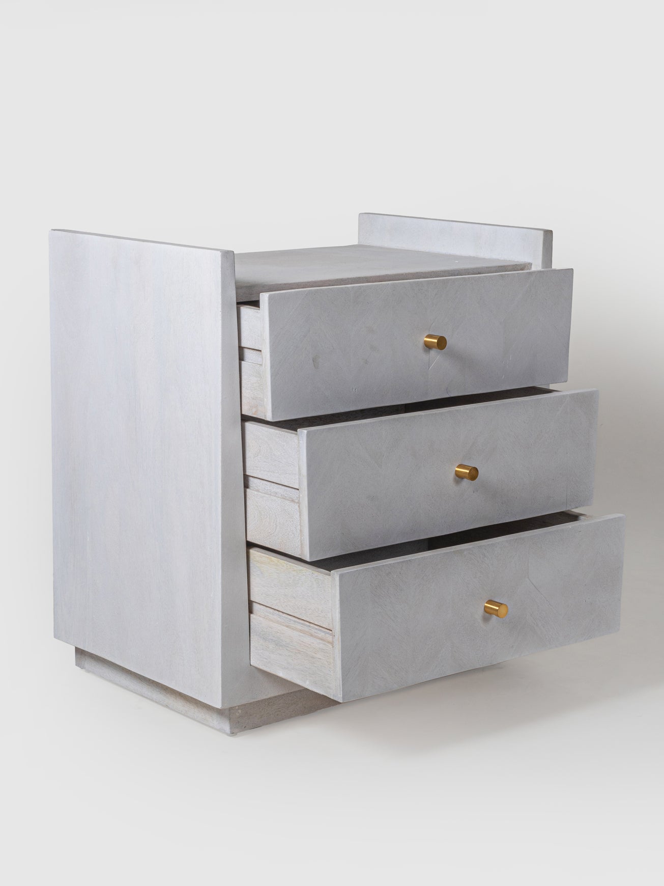 A contemporary three-drawer chest with a minimalist design, featuring a subtle chevron pattern and gold knobs. Crafted for elegance and functionality, this piece complements modern interiors while providing ample storage.