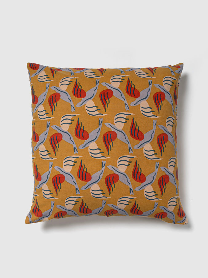 This eye-catching cushion cover features a bold, artistic pattern of stylized birds in light blue and red, beautifully contrasted against a vibrant mustard-yellow background. The dynamic design, characterized by its flowing lines and abstract forms, infuses any space with a modern, playful vibe. Perfect for adding a creative flair to contemporary living rooms or eclectic interiors.