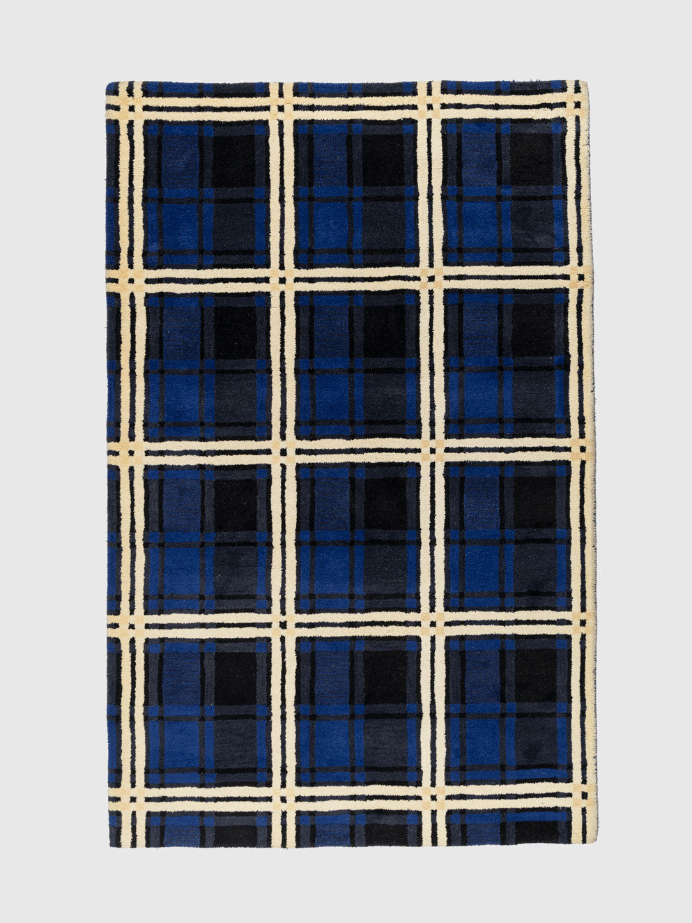 Bring refined structure and bold character to your home with the Sunsari Wool Tufted Carpet. Crafted from high quality wool, this design showcases a striking plaid pattern in deep navy tones highlighted with warm ivory lines. The grid layout creates a strong contemporary presence that complements both modern and transitional interiors.