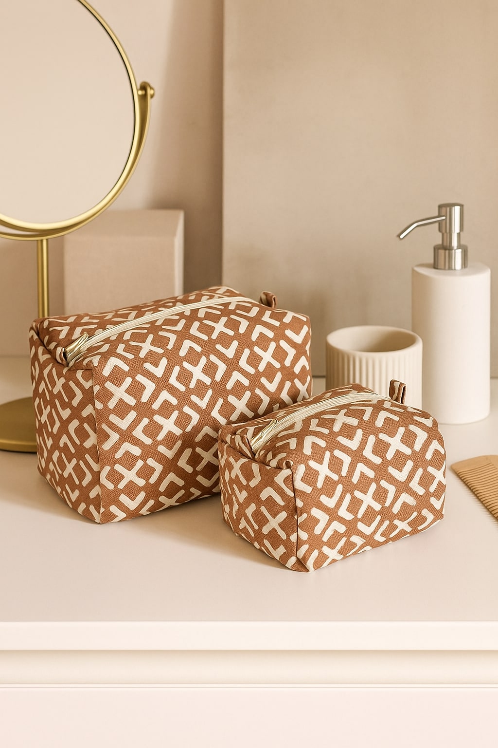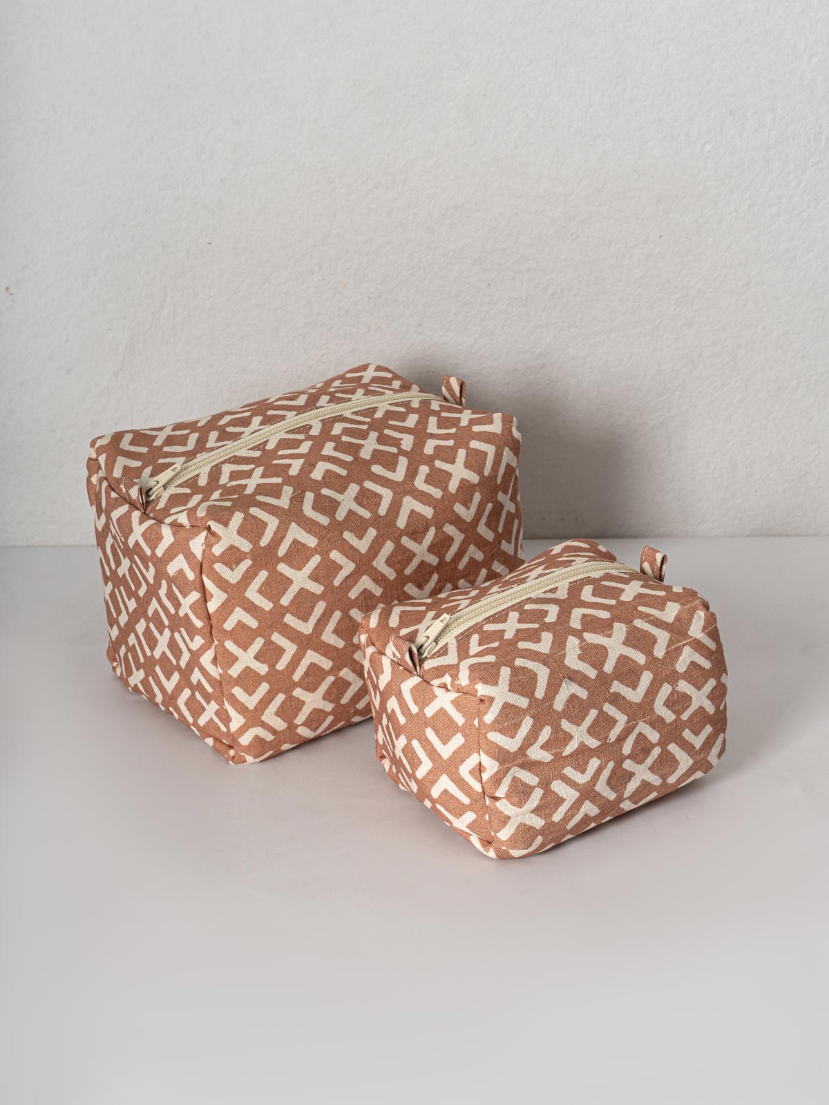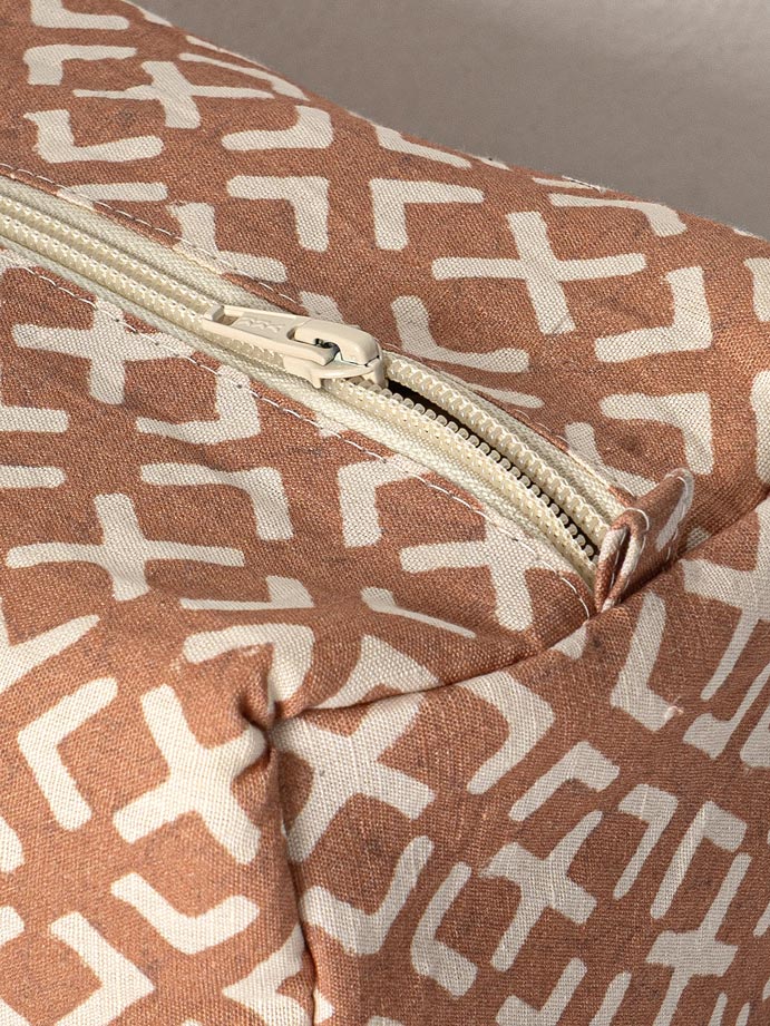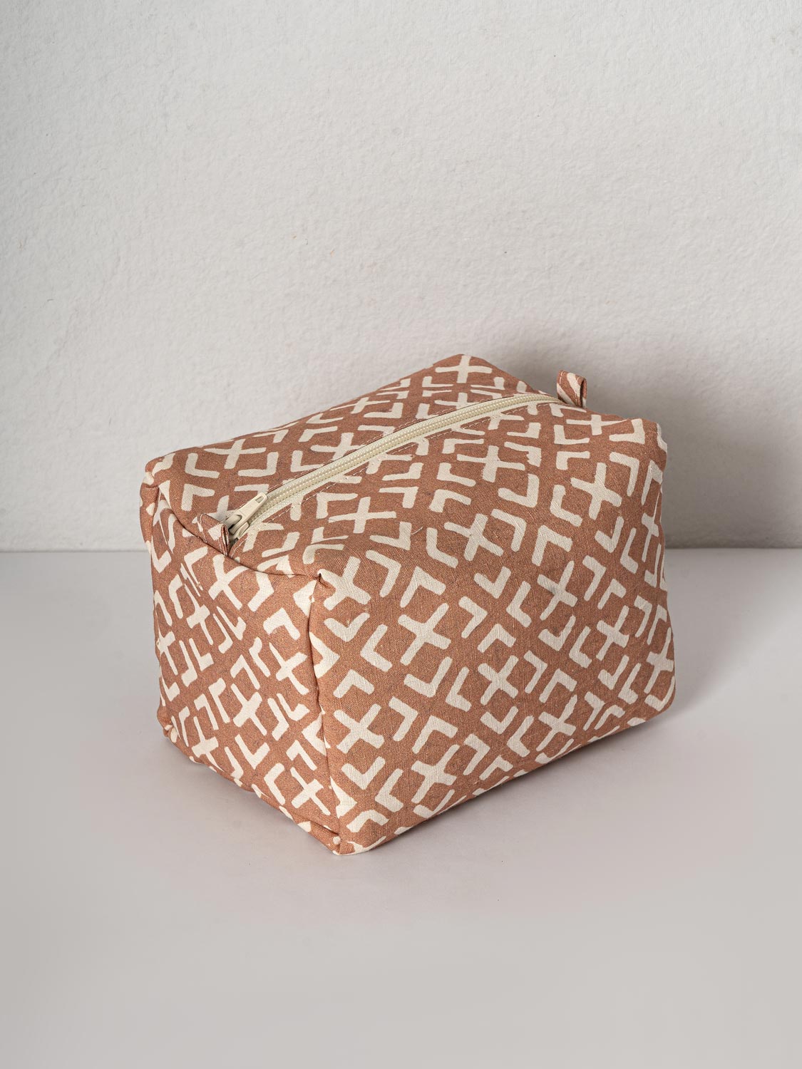 With a bold geometric pattern in rust and white, this pouch combines modern aesthetics with traditional craftsmanship. Its durable fabric and structured shape make it perfect for carrying toiletries, stationery, or makeup essentials. Featuring a secure zipper and side loops, it’s a stylish and practical choice for home or travel.
