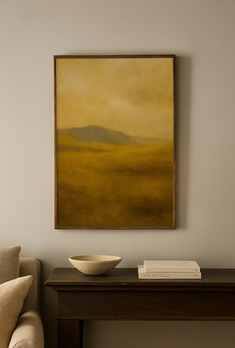 The Amber Plains is a tribute to nature’s golden beauty, depicting rolling fields bathed in warm, earthy hues beneath a soft, hazy sky. This printed canvas artwork radiates calm and timelessness, capturing the essence of open landscapes where silence feels vast and endless.