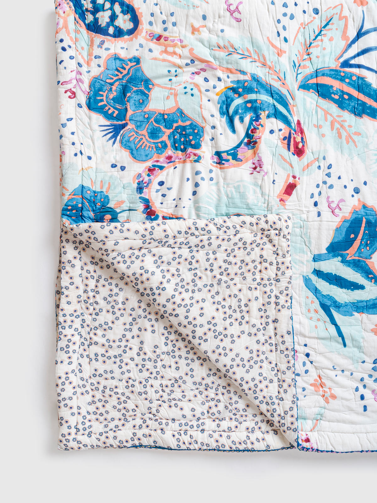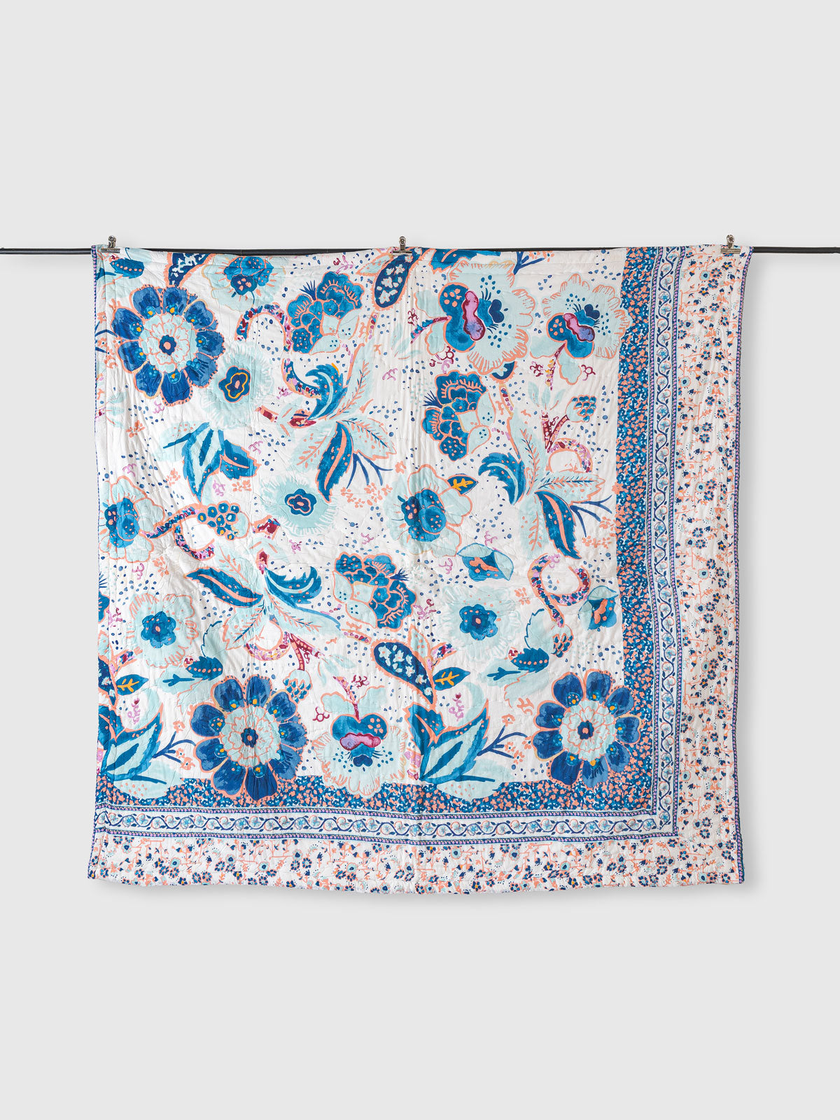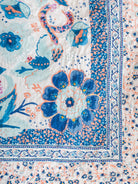 The Marisol Printed Quilt brings the gentle charm of nature into your home with its graceful hand printed florals and soft, sunlit palette. The cream base is adorned with blooming blue flowers, delicate vines and warm touches of terracotta and gold, creating a design that feels fresh, soothing and beautifully detailed. The ornate printed borders add depth and structure, giving the quilt a refined, timeless presence.