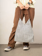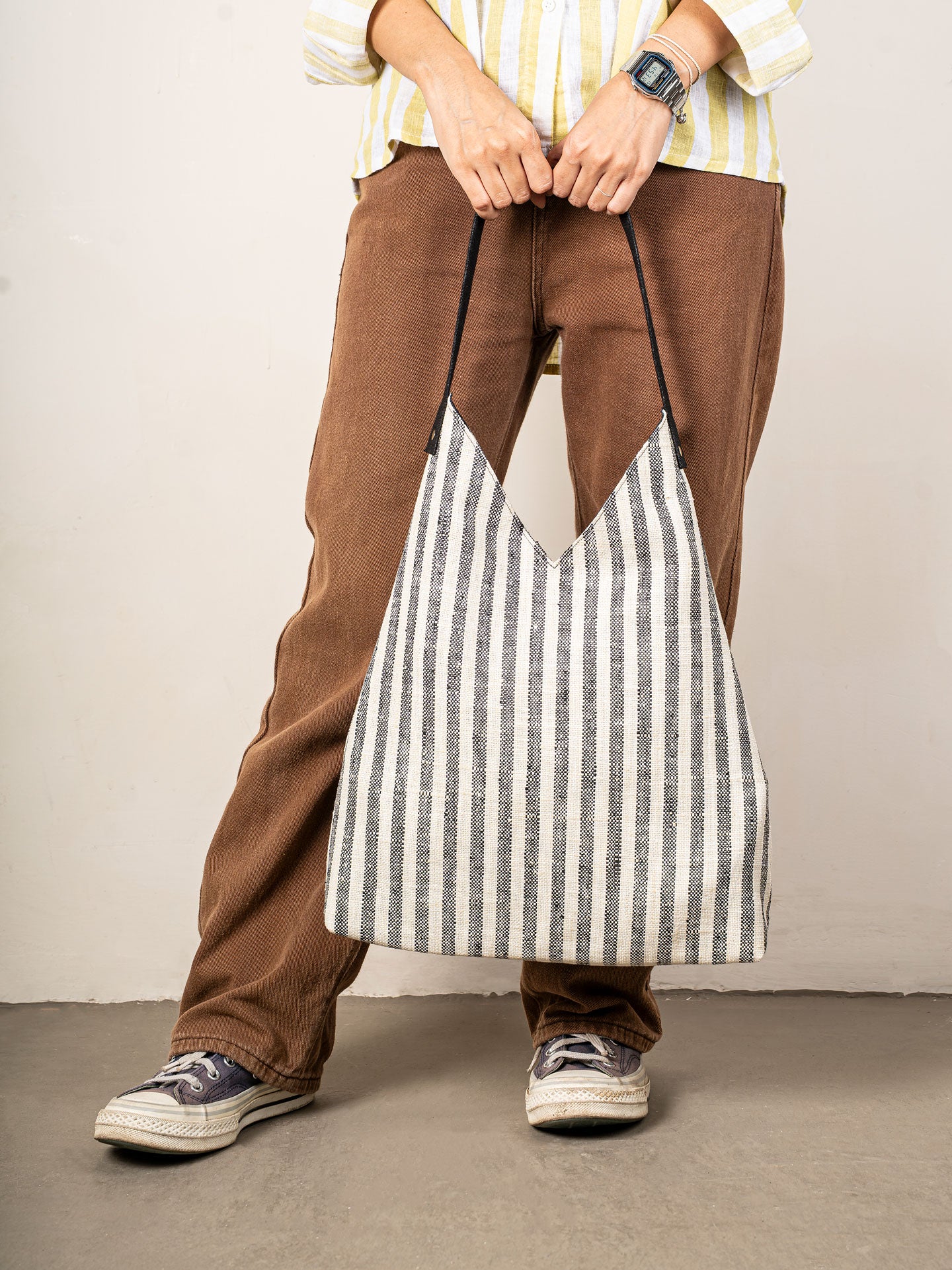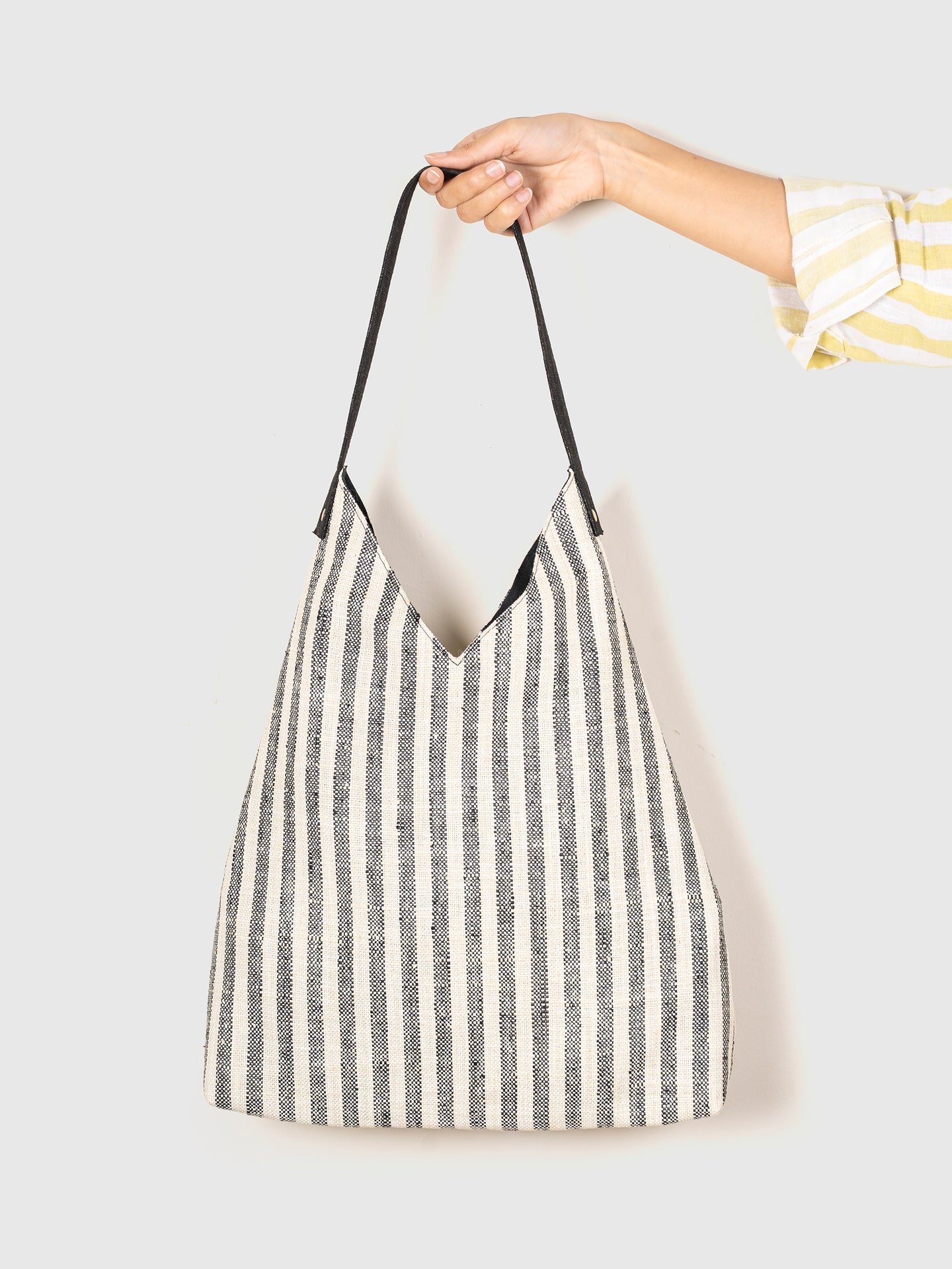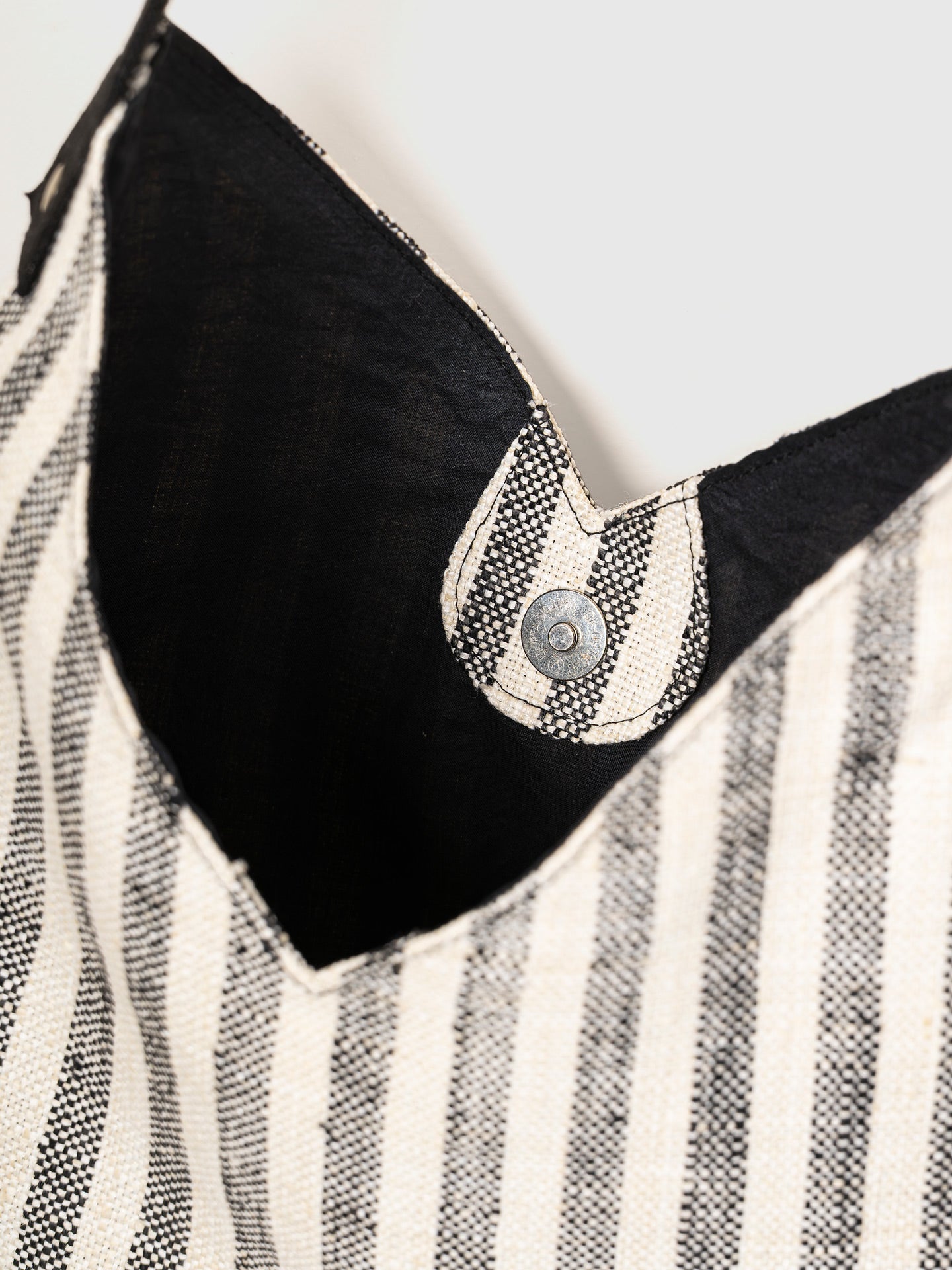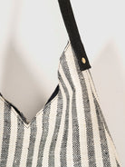 Crafted with a timeless black-and-white stripe pattern, this soft-structured tote is designed for everyday movement. The deep V-cut adds a sculptural silhouette, while the secure snap button closure keeps your essentials safe on the go. Reinforced with a sturdy single strap, it's comfortable to carry whether slung over your shoulder or folded inside a suitcase.