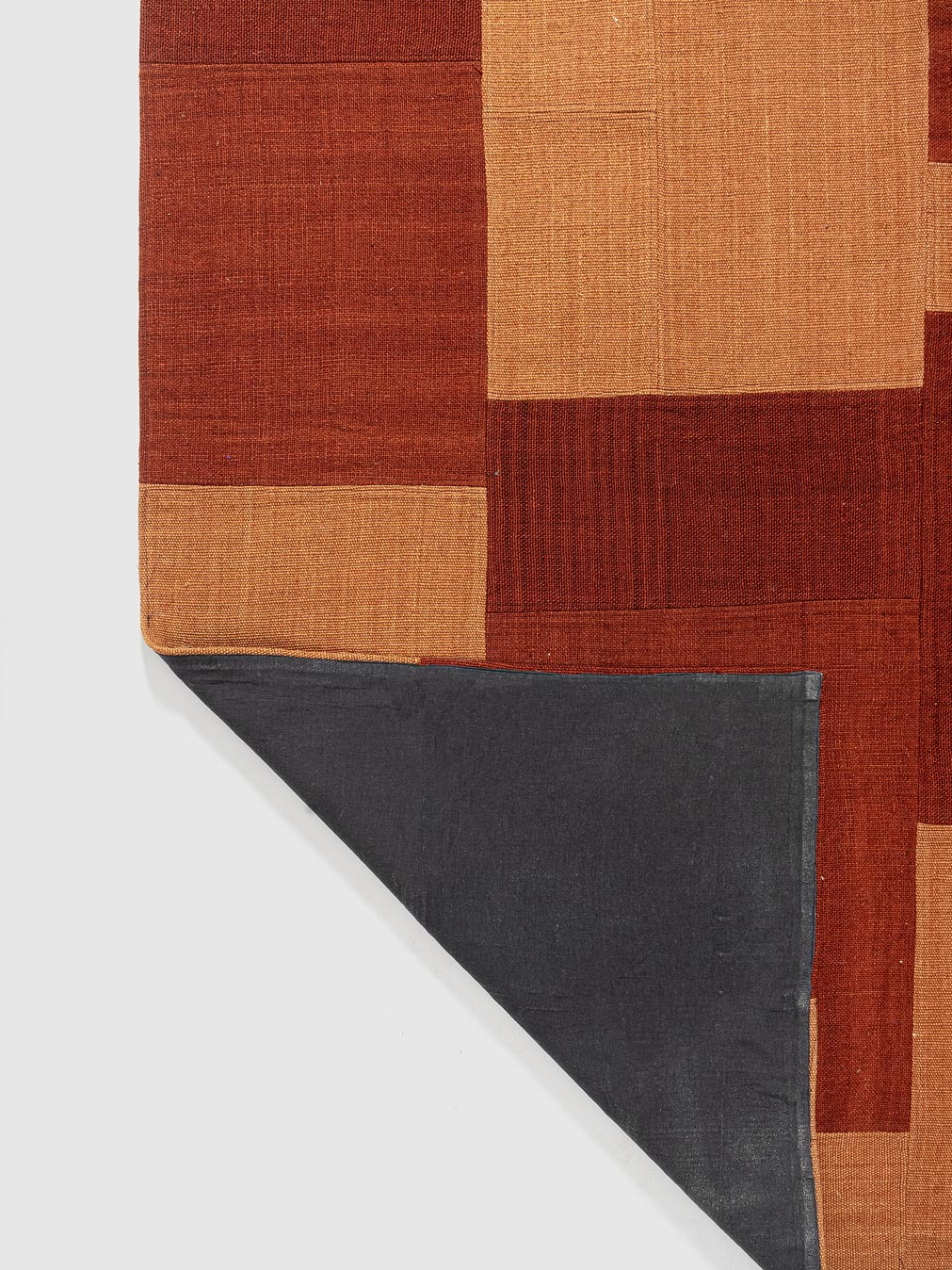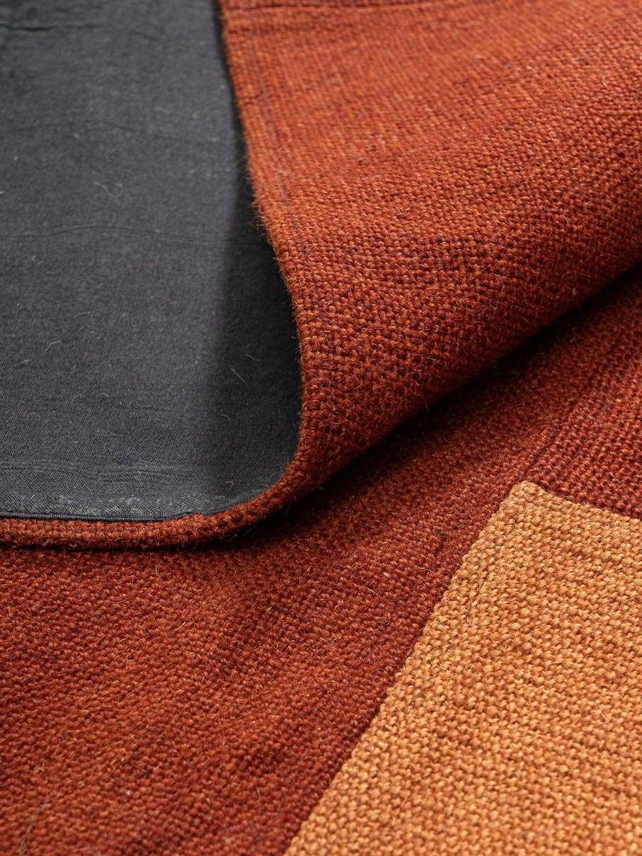 Elevate your interiors with this handcrafted wool patch rug in warm terracotta and ochre tones. Its bold block pattern and earthy color palette add a rustic charm to any room. Made from sustainable cotton, this eco-friendly area rug is perfect for modern, boho, or ethnic home décor styles.