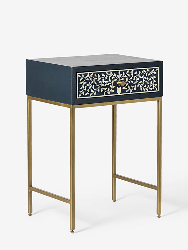 Truett Side Table, visually a very delicate and intricate piece of art is a perfect example of beauty and functionality. It features a floral bone inlay pattern on the drawer front, with gold legs for a touch of luxury.