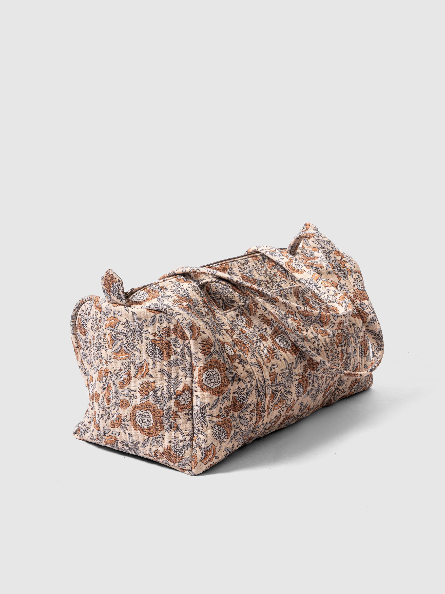 A perfect companion for weekend getaways or day trips, the Vintage Garden Duffle is crafted from soft quilted cotton with a charming floral block print in earthy tones. Lightweight yet spacious, it features padded handles and a sturdy zip for secure carrying.