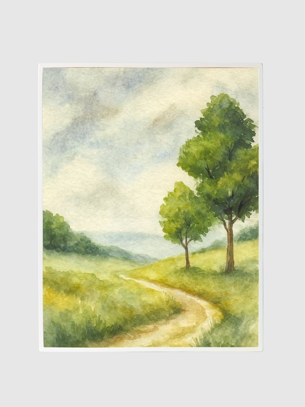 The soft brush-like details and fresh tones of green and gold create an atmosphere of warmth and serenity, inviting you to pause and let your spirit roam free. It is a scene that reflects simplicity, freedom, and the beauty of nature’s open embrace.