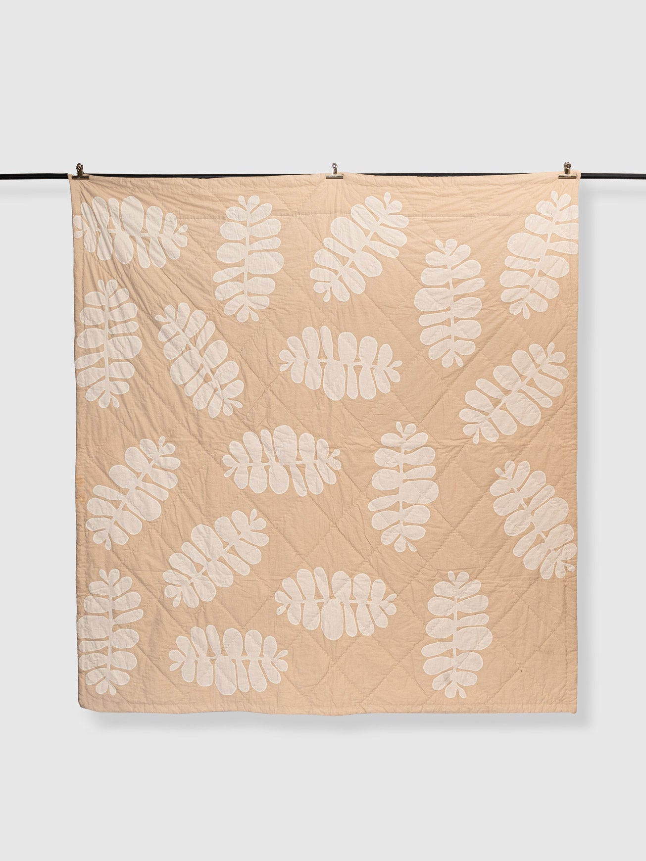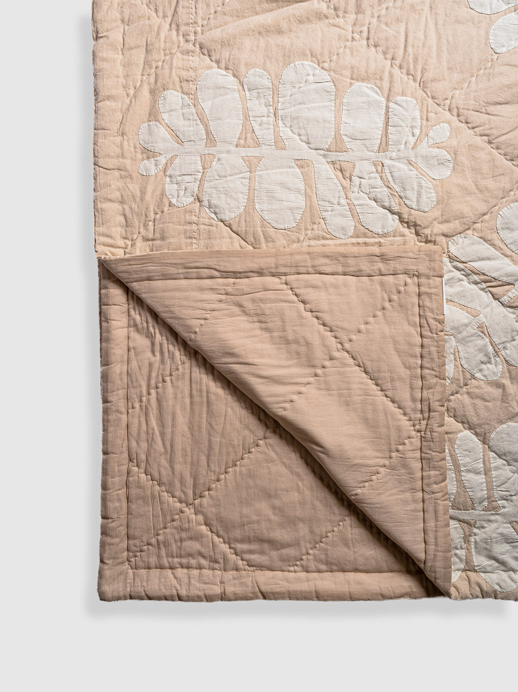 Adorn your home with this beautiful botanical applique quilt. Featuring hand-stitched white leaf patterns on a soft beige cotton quilt, it’s perfect as a bedspread or lightweight summer quilt. This modern floral quilt blanket brings an airy, nature-inspired aesthetic that suits contemporary, bohemian, or coastal bedroom décor.