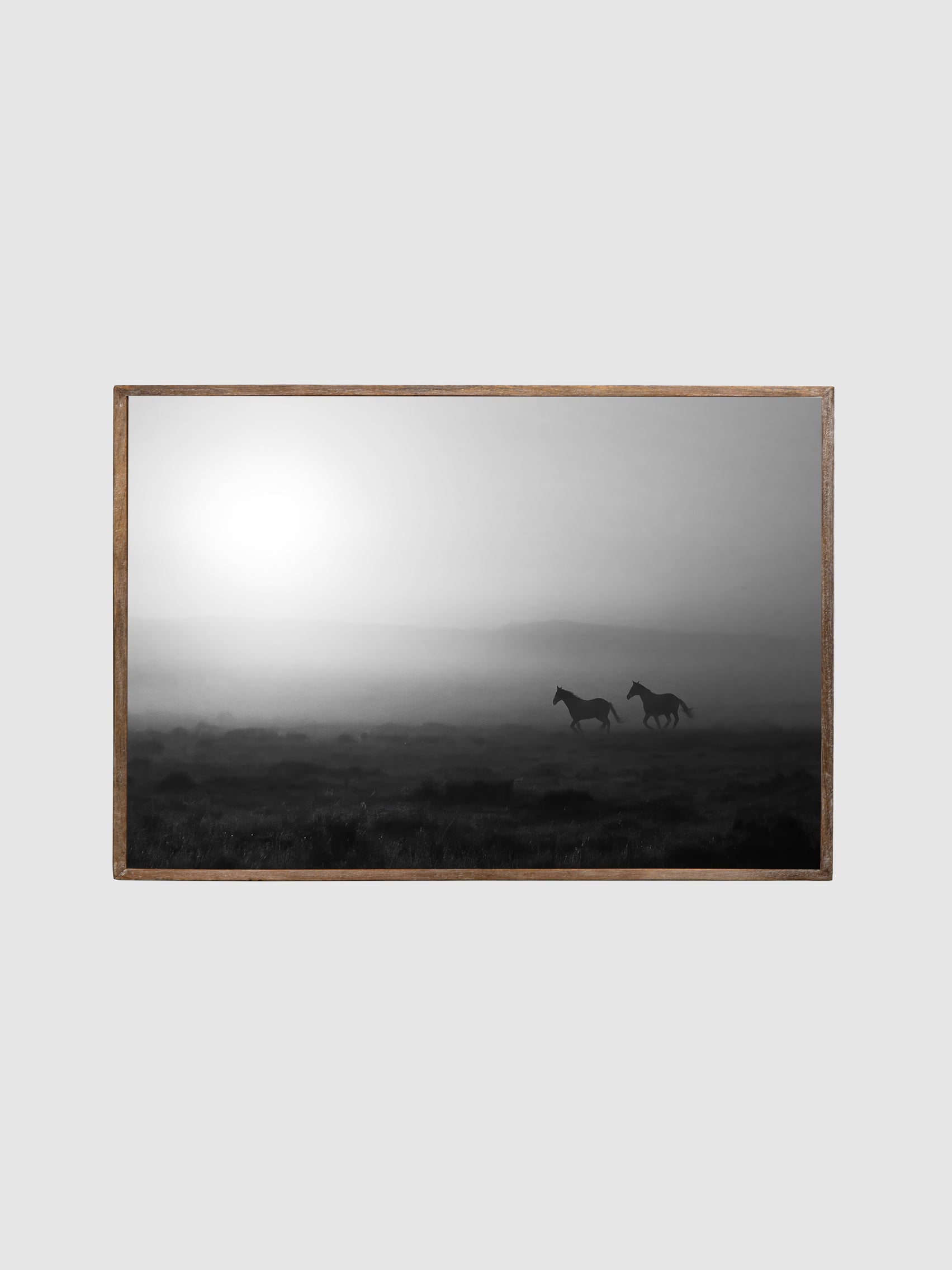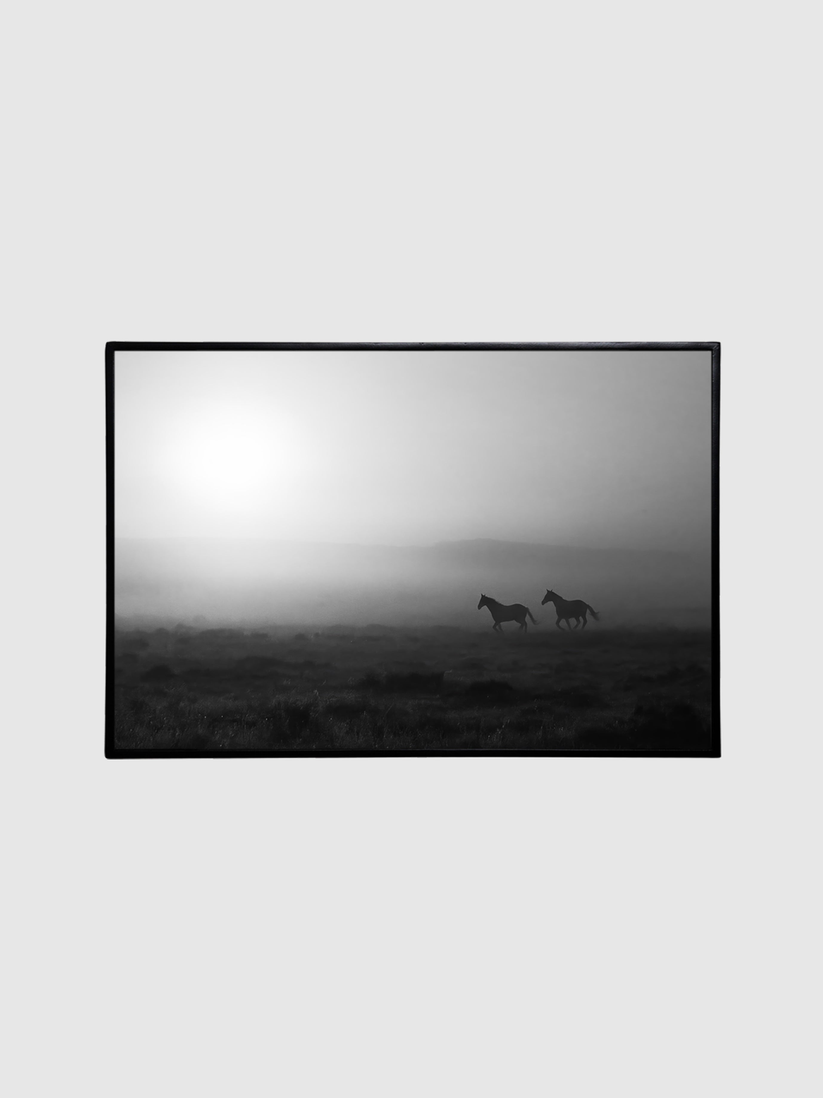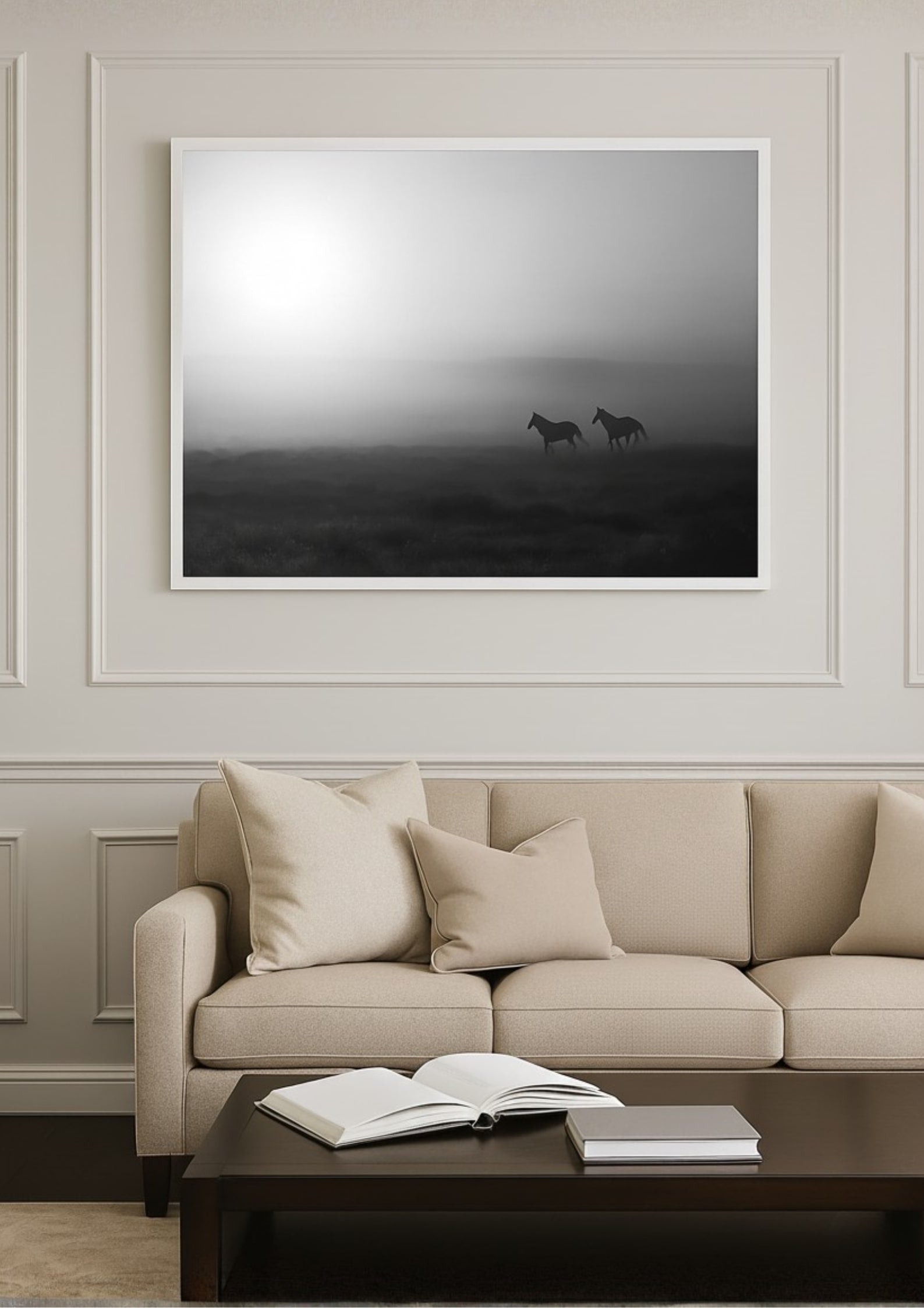 Winds of Freedom captures the raw spirit of untamed nature with two wild horses galloping across a mist-covered field. The monochrome tones and sweeping landscape create an atmosphere of mystery and exhilaration, evoking both the beauty of open spaces and the unrestrained energy of freedom.