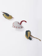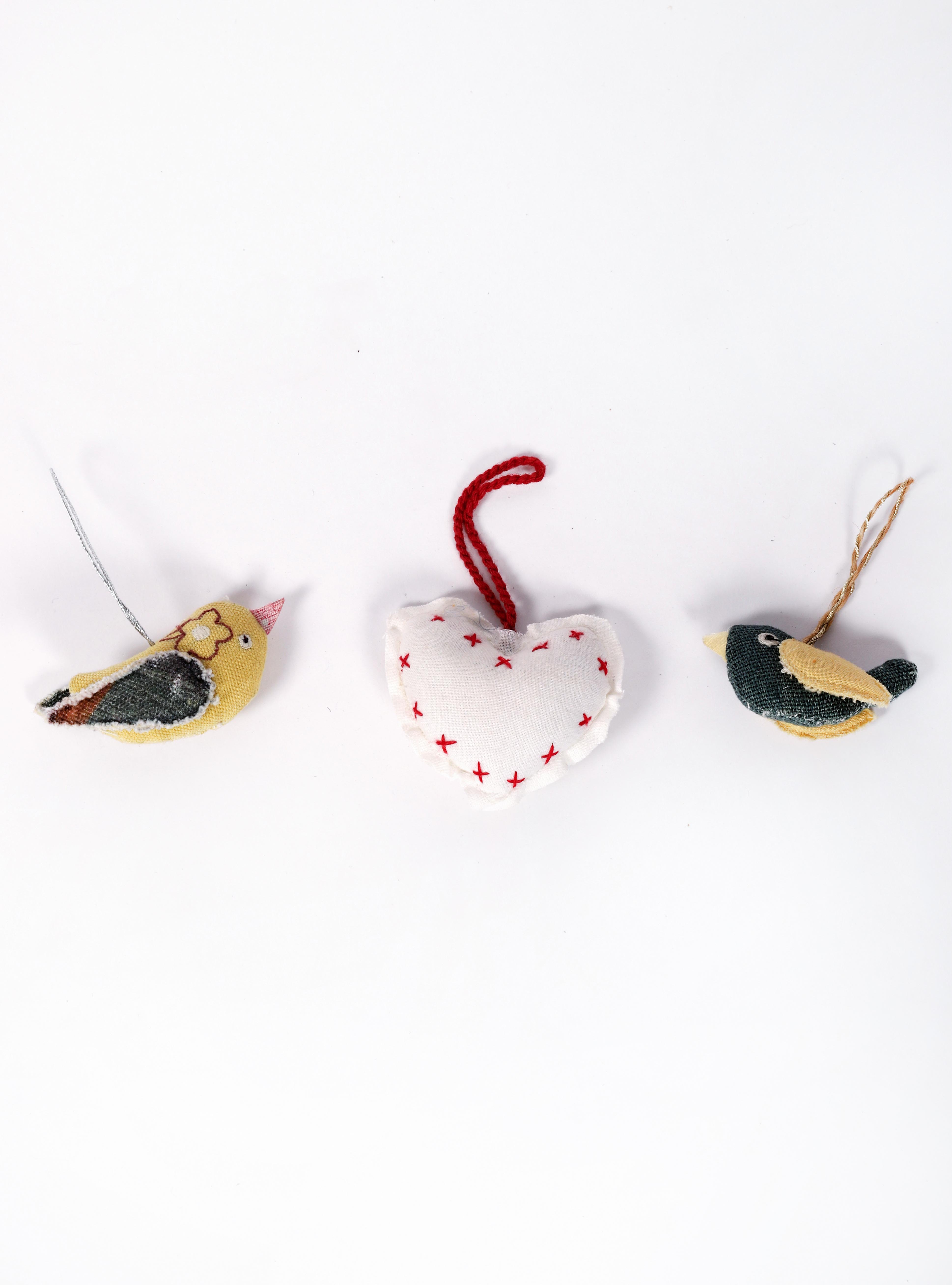 Sweet and sentimental, this trio includes two charming birds and a stitched heart, each handmade using upcycled textiles. Lightweight and full of character, they add a warm, crafted touch to festive décor, nursery corners, or thoughtful gifting. A gentle nod to sustainable living with storybook-like charm in every stitch.