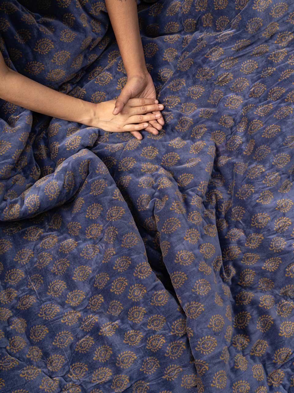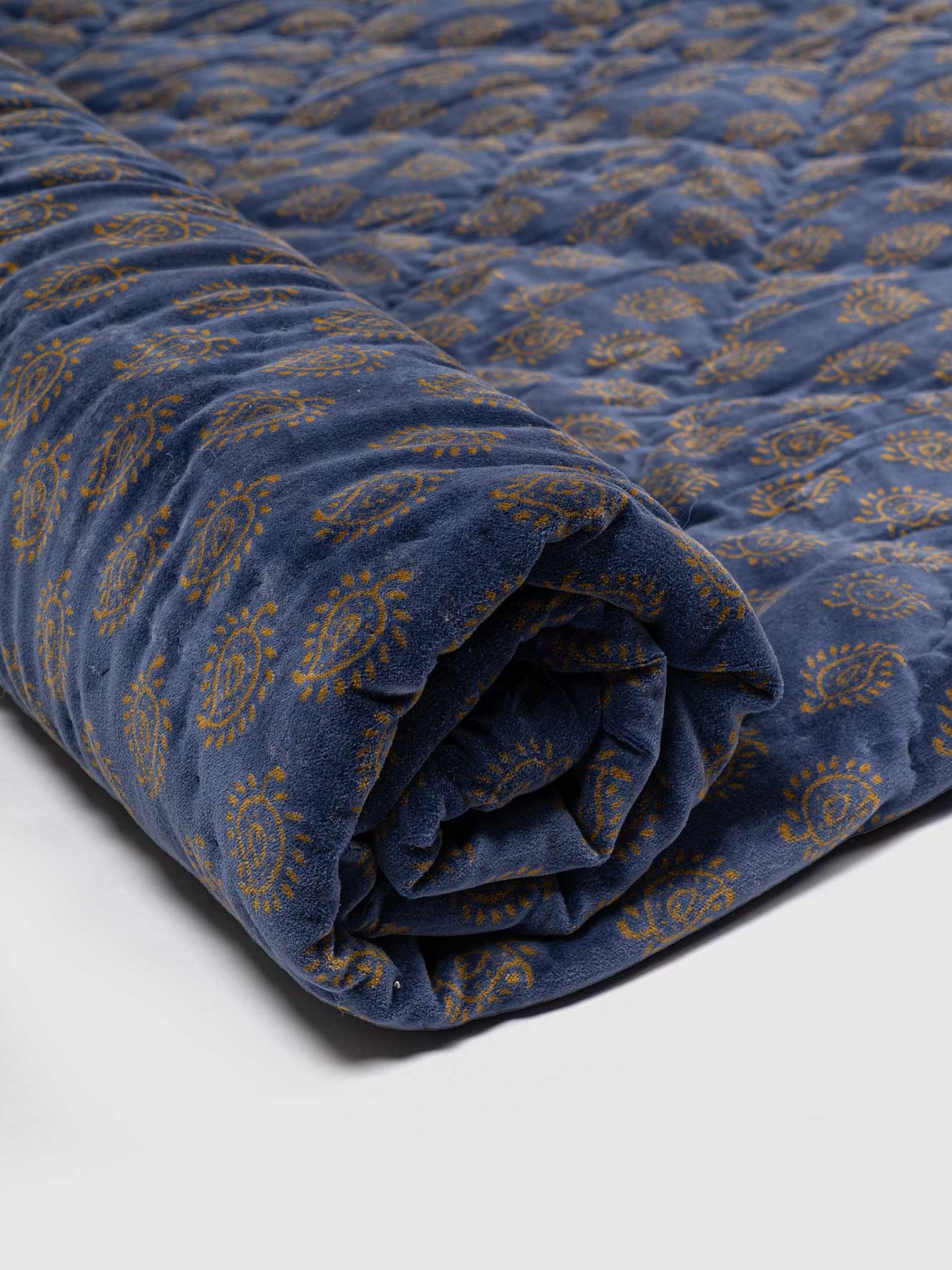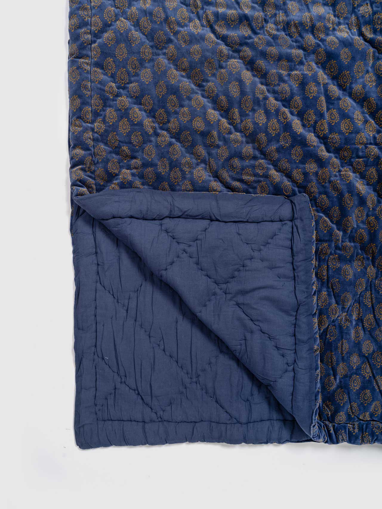 This luxurious quilt features a deep navy hue with intricate golden motifs, exuding timeless elegance. Perfect for sophisticated interiors, it adds warmth and a regal touch to beds or lounges. Crafted for comfort and style, this quilt seamlessly complements modern or traditional decor, making it a versatile home essential.
