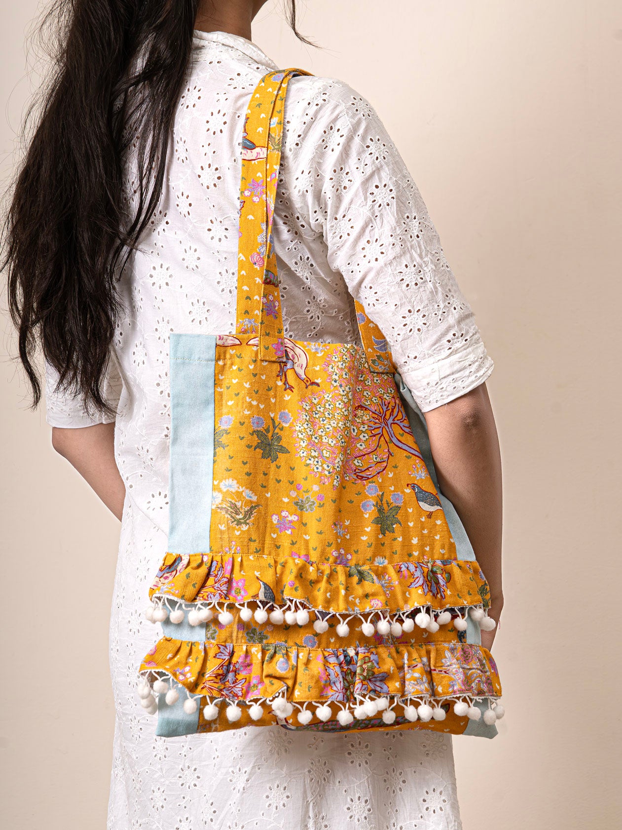 Meet your new mood booster - the Champa & Chill Tote Bag! Bursting with bright florals and fun ruffles, it’s roomy enough for all your college books, mandi hauls, and chai-date essentials. Lightweight and durable, this tote adds a splash of joy and energy to every errand and hangout.