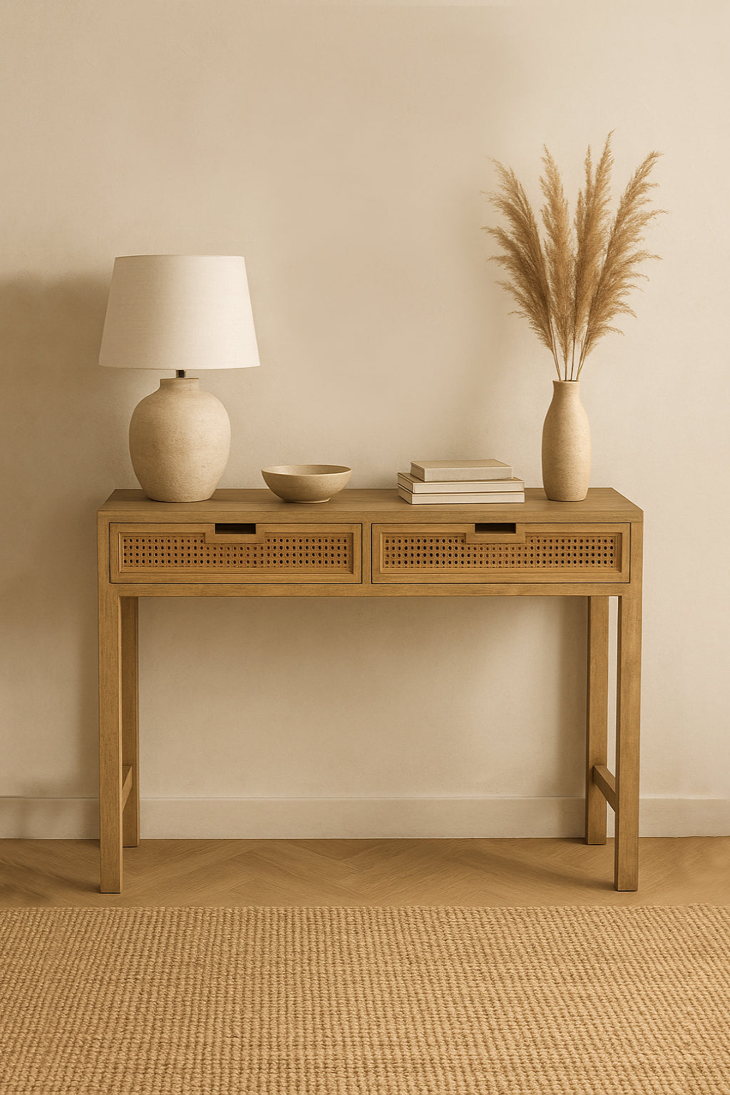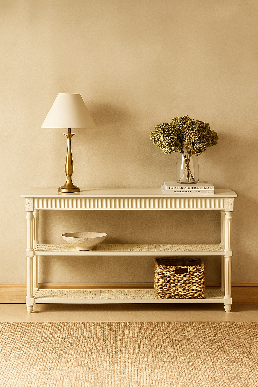 Console table with a vase, books, and basket against a beige wall.