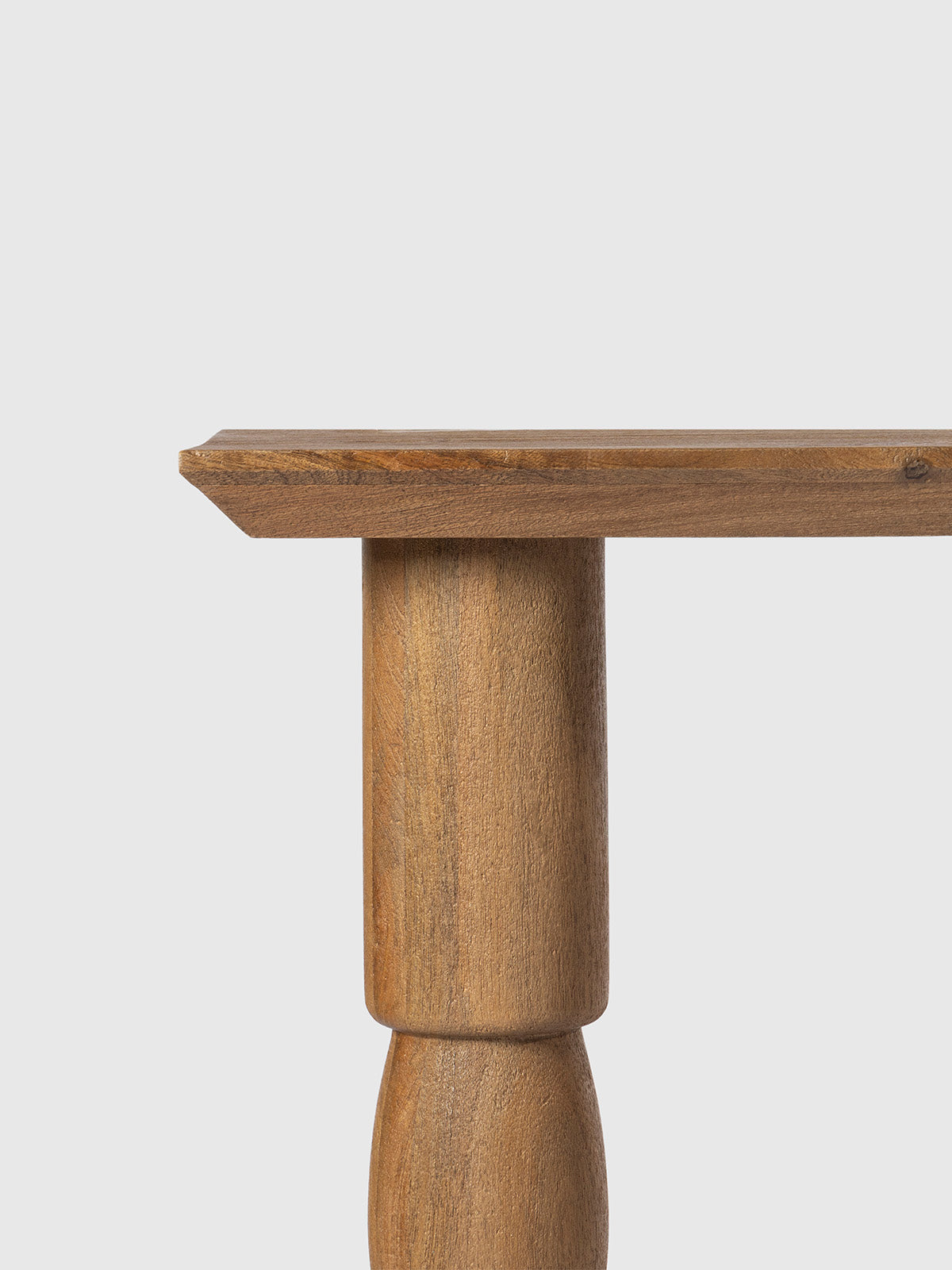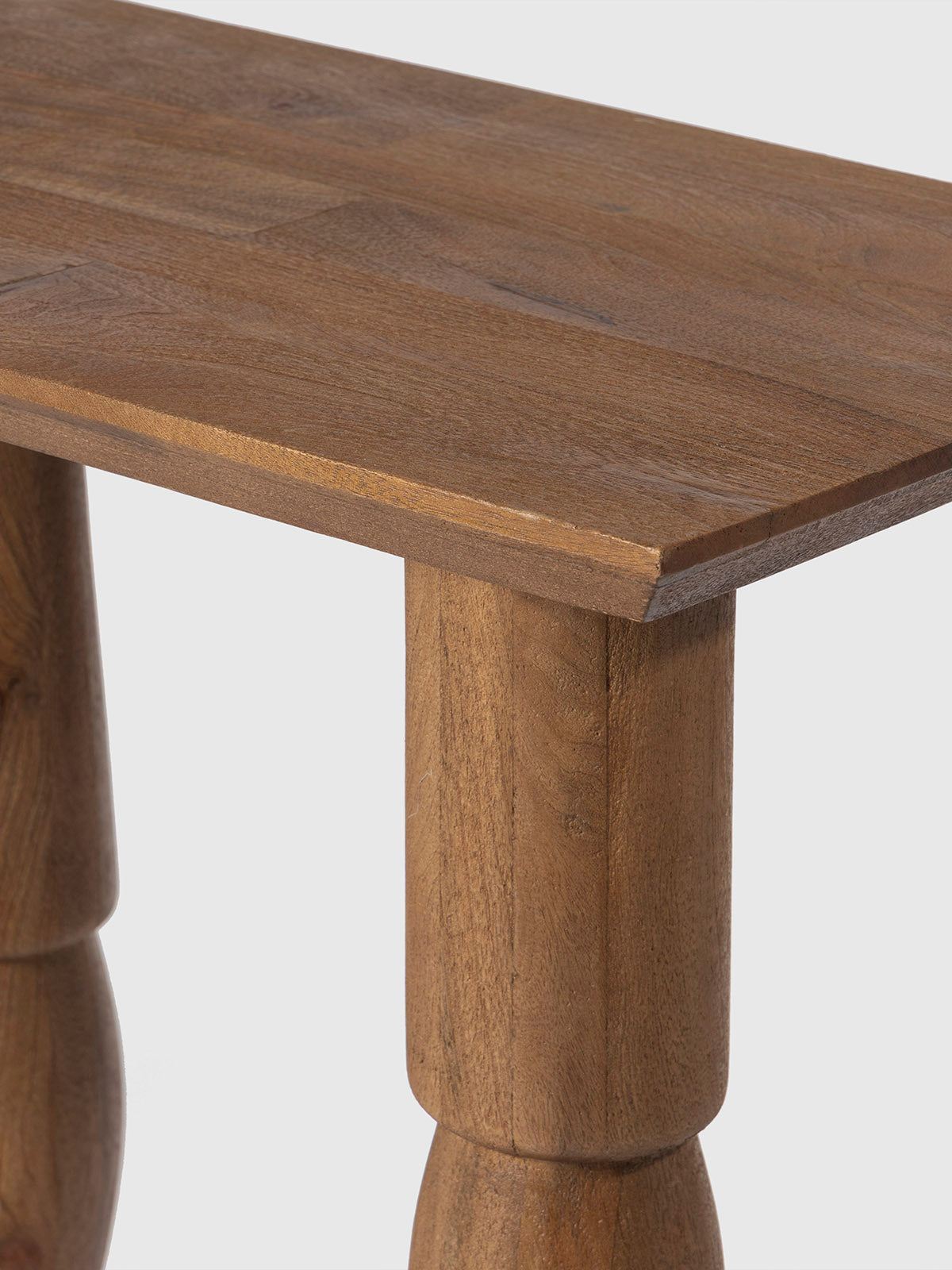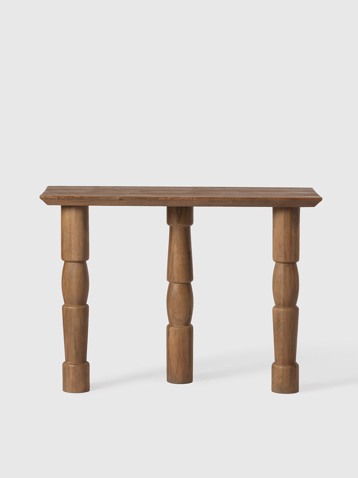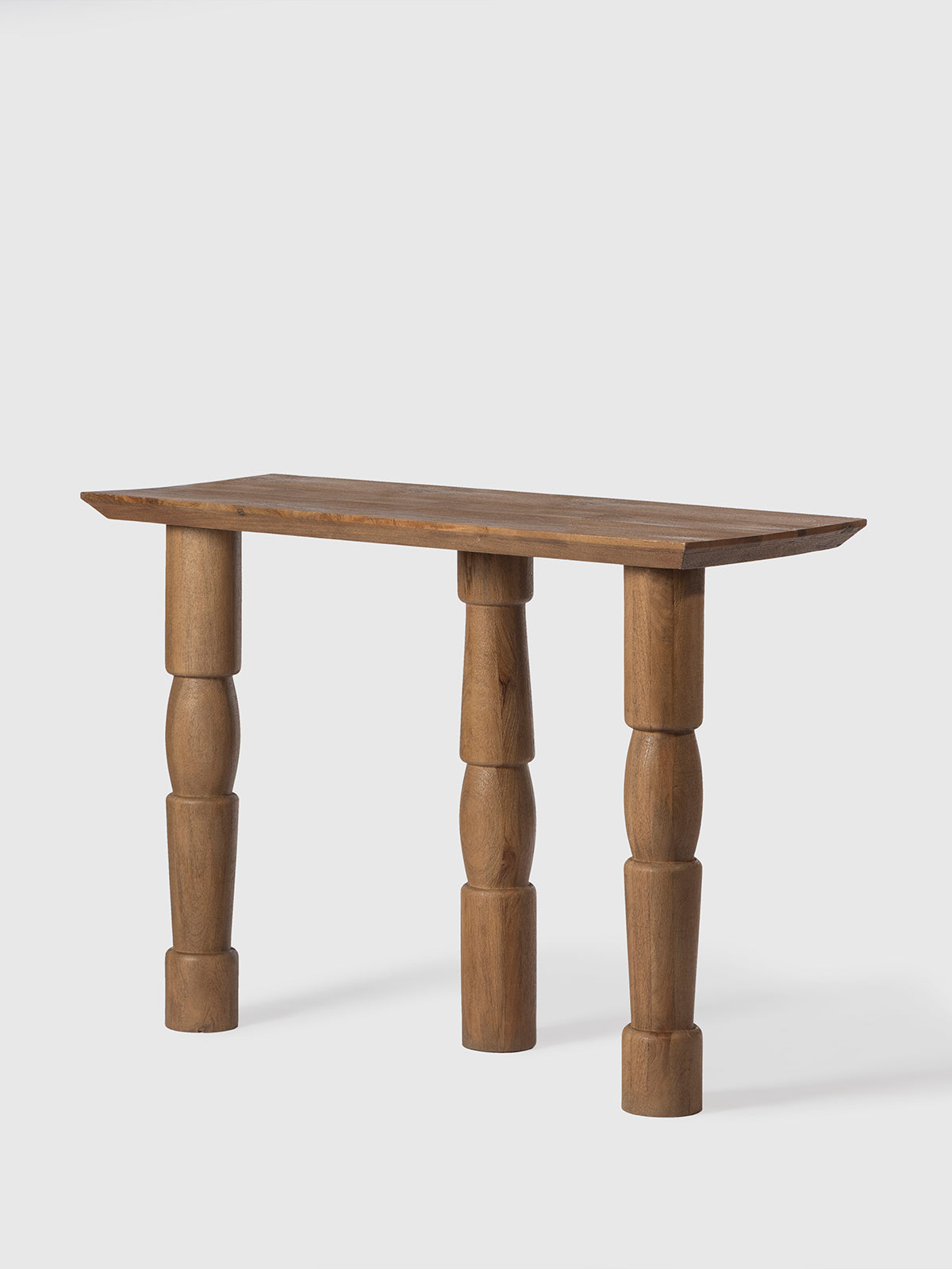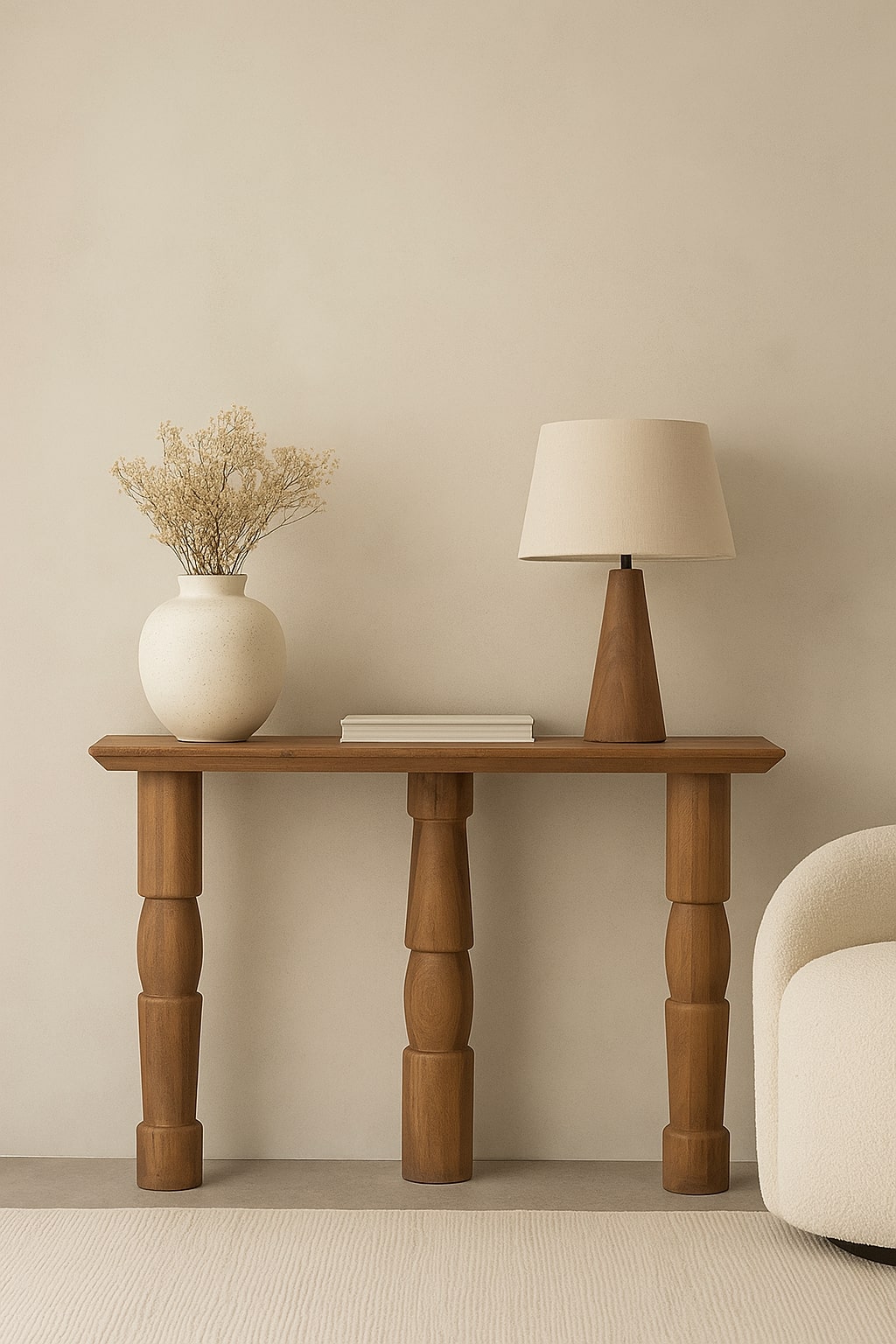 Striking in form and simplicity, this handcrafted console table features bold, sculpted legs and a clean, linear top. The natural wood finish highlights the organic grain and warm tones, bringing a rustic yet refined appeal to any space. Its artistic silhouette makes it a versatile piece—perfect for entryways, hallways, or behind a sofa. Style meets substance in every detail.