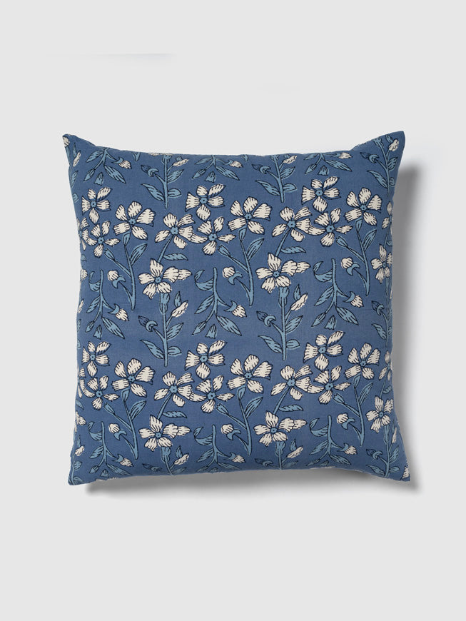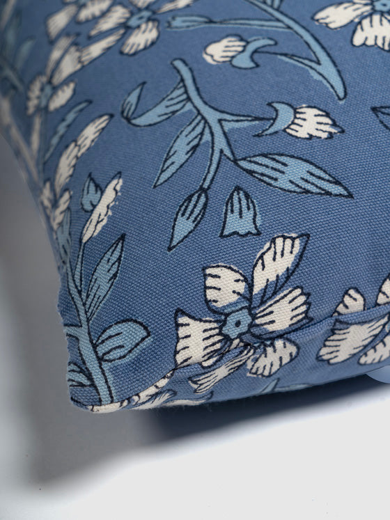 Delicate floral pattern on a calming blue background. The white flowers are intricately detailed, giving the design a serene and classic appeal. Perfect for creating a tranquil atmosphere in your living space, this cushion cover effortlessly blends traditional charm with modern elegance.