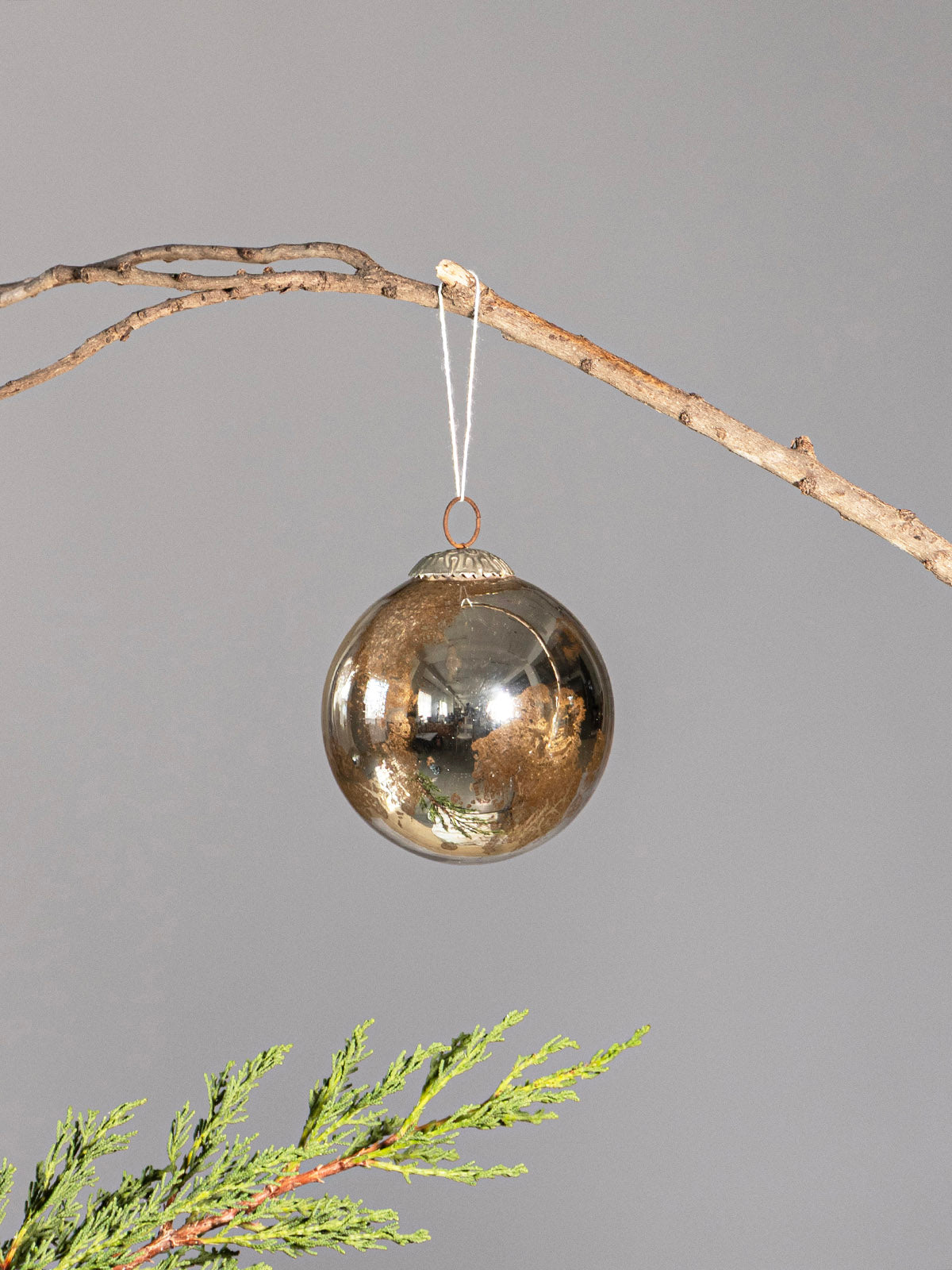 Enhance your festive décor with the soft golden glow of the Shilthar Mercury Christmas Ornaments. Designed in a classic round silhouette, this ornament features a beautifully aged mercury glass finish that reflects light with a warm and enchanting radiance. The subtle speckled texture adds depth and character, giving your Christmas tree a refined and timeless charm.