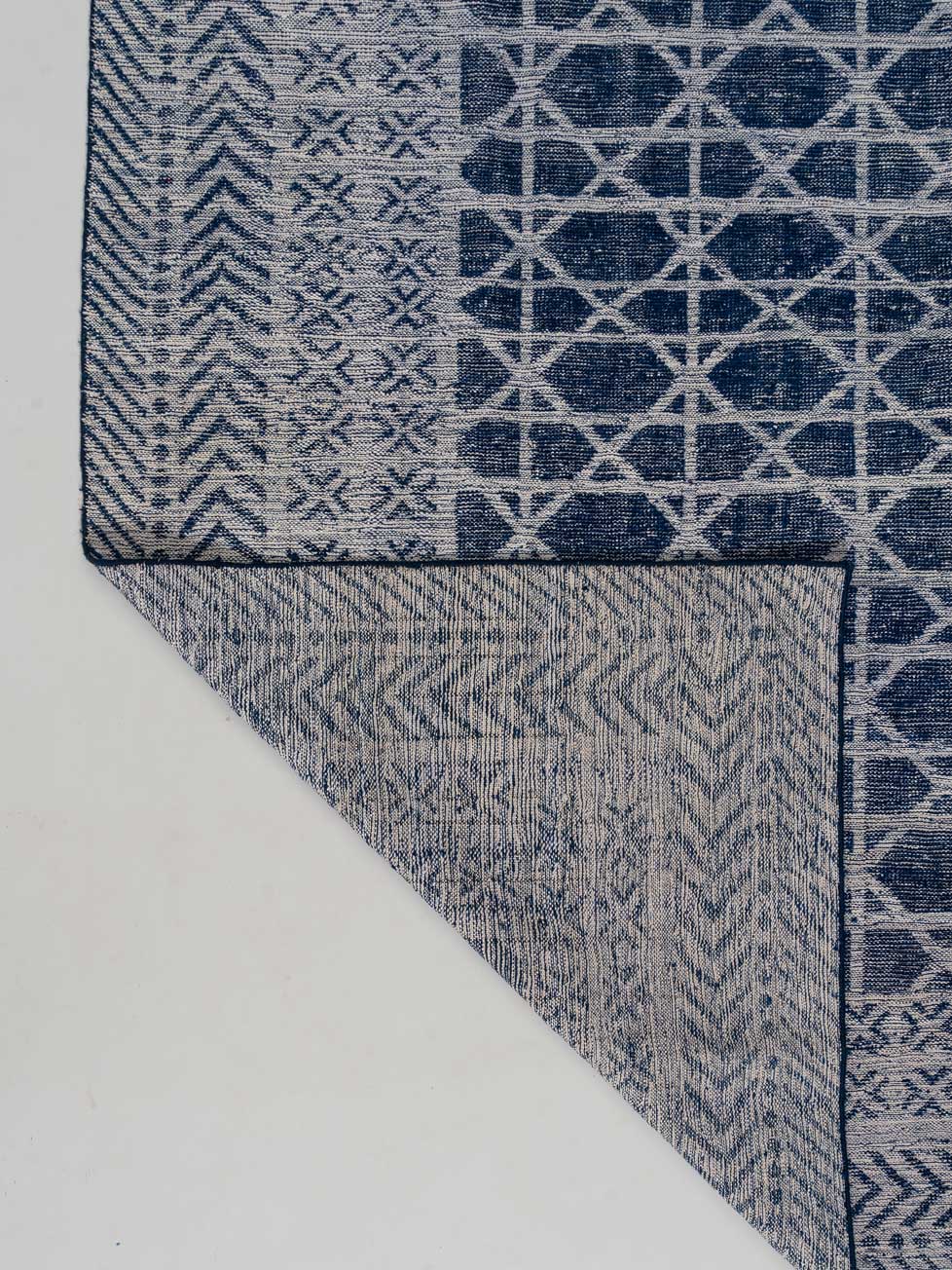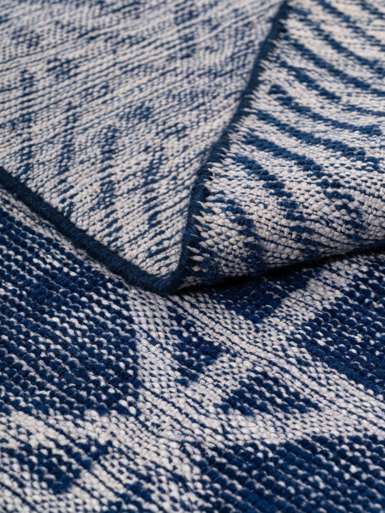 Featuring a striking design with bold, geometric patterns set against a rich navy and grey backdrop, our hand-knotted Moken Rug offers both visual appeal and durable comfort. Perfect for enhancing any room with a touch of contemporary artistry, it's ideal for those looking to make a sophisticated statement in their home decor.