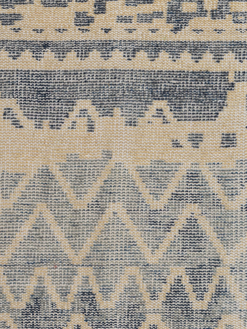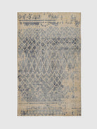 Bring serenity, texture and Scandinavian charm into your home with the Oland Wool Knotted Carpet, a hand knotted rug that blends cool tones with timeless geometric detailing. Its soft ivory base is gently washed with muted grey and slate blue, creating a calming, weathered look reminiscent of coastal landscapes and Nordic textiles. The delicate diamond motifs and horizontal patterning appear like they have naturally faded over time, giving the rug a beautifully lived-in elegance.