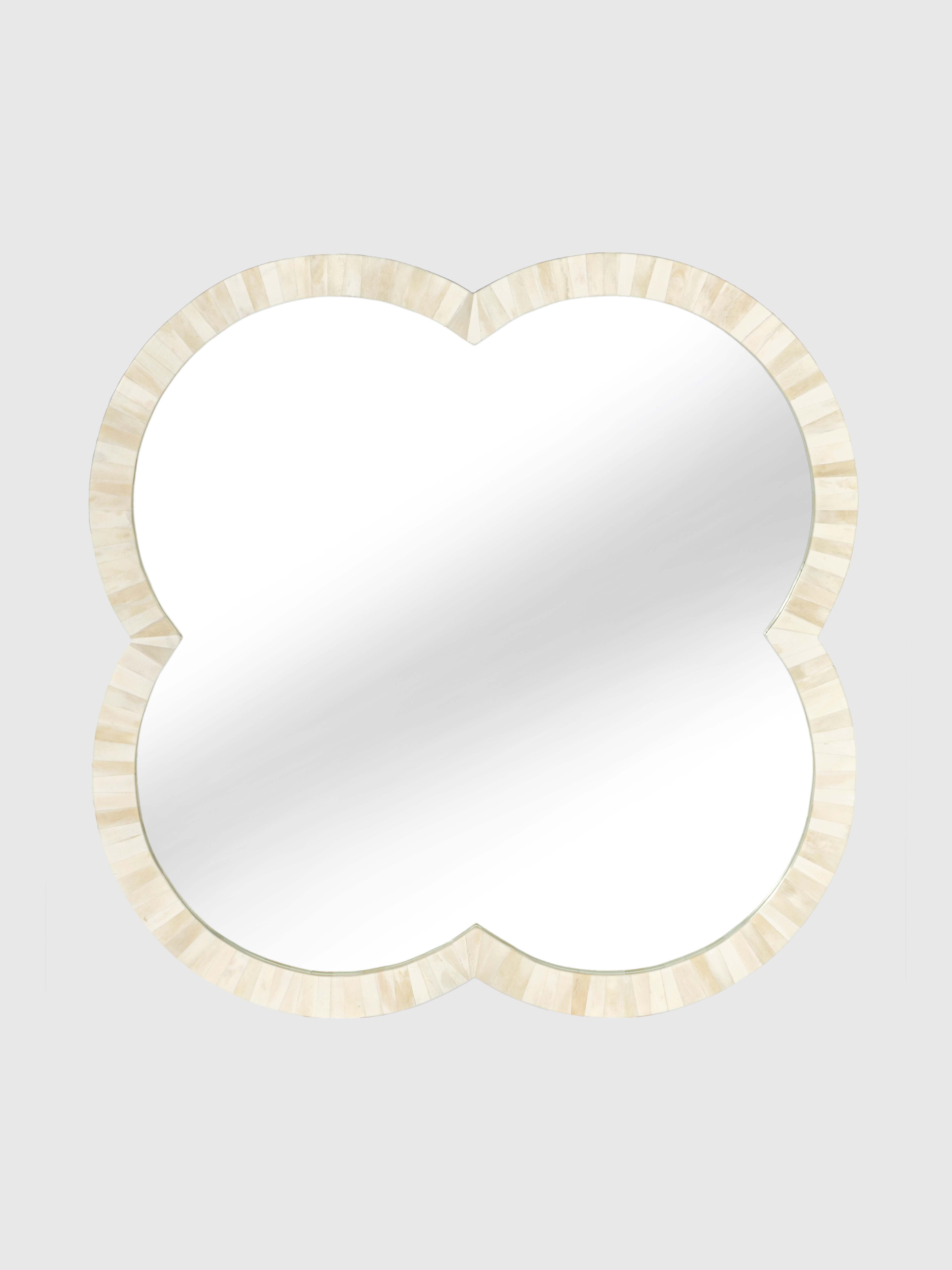 This quatrefoil bone inlay mirror brings timeless elegance to any room. Handcrafted with delicate bone inlay along its gently curved frame, the design balances artisanal tradition with a modern geometric form. Ideal for an entryway, bedroom, or living space, it adds light, depth, and a refined decorative accent to your home.