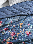 One side features a lush arrangement of fruits and florals layered over a deep twilight-blue base, giving the quilt a beautifully opulent, nature-inspired presence. The reverse softens into a subtle tonal pattern on the same blue background, offering a calmer, understated mood whenever you want a more minimal look. Light, breathable, and exquisitely quilted, it promises year-round comfort with a refined, textured finish.