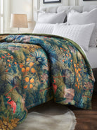 One side reveals a rich forest tableau painted in deep greens, ochres, and blues, filling your space with movement and character. The reverse shifts to a muted earthy green with a soft, calming undertone, offering a grounded, contemporary look for days when you prefer a quieter aesthetic. Soft, breathable, and meticulously hand-quilted, it carries a luxurious, tactile feel that makes it truly special.
