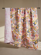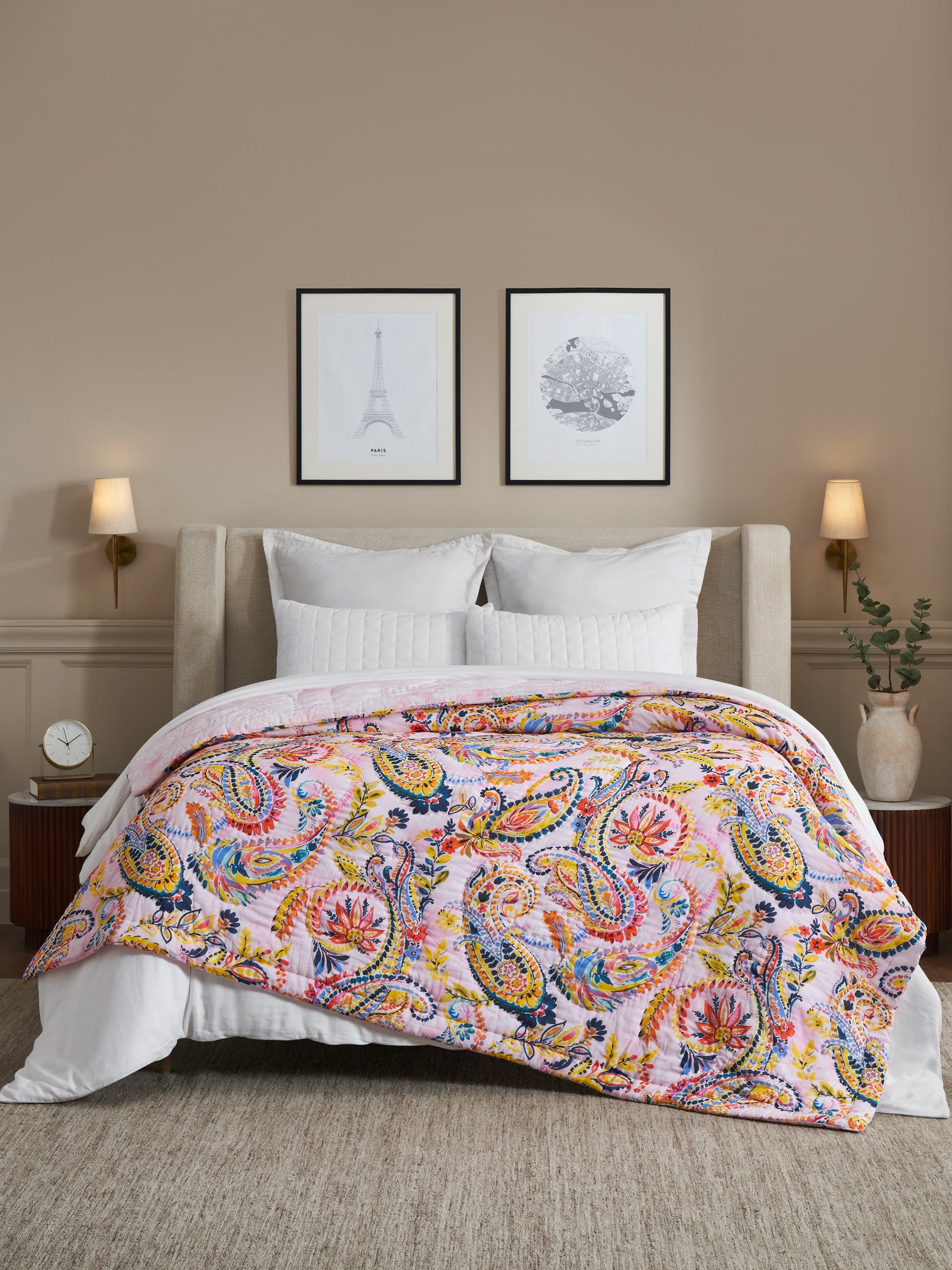 One side showcases a lively mix of pinks, yellows, blues, and soft greens arranged over a gentle blush base, creating a spirited, eclectic mood that brightens any bedroom. The reverse shifts to a subtle tone-on-tone paisley pattern in a soft pastel pink, offering a calm, minimal look whenever you prefer something understated. Light, breathable, and enriched with hand-quilted texture, it promises year-round comfort with a luxurious, tactile finish.