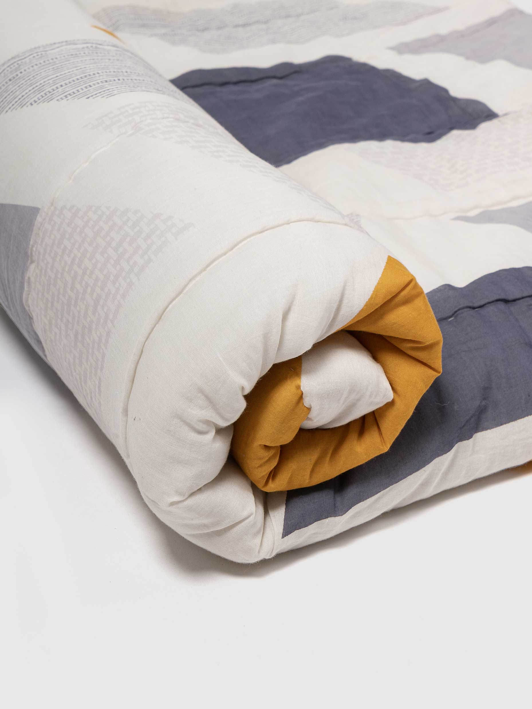 Moana quilt features a bold geometric design in vibrant mustard yellow, soft grey, and white tones. Perfect for contemporary interiors, its striking pattern adds energy and sophistication to any space. Lightweight yet cozy, it’s an ideal accent for bedrooms or living rooms, blending style with comfort effortlessly.