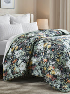 One side reveals a deep, garden-inspired bloomscape in soothing greens, soft whites, and gentle touches of yellow and blush, creating a mood that feels both grounded and enchanting. The reverse shifts to a calm sage-green solid with a soft, muted undertone perfect for moments when you want a serene, minimal look. Light, breathable, and enriched with hand-quilted detail, it offers year-round comfort with a premium, tactile finish.