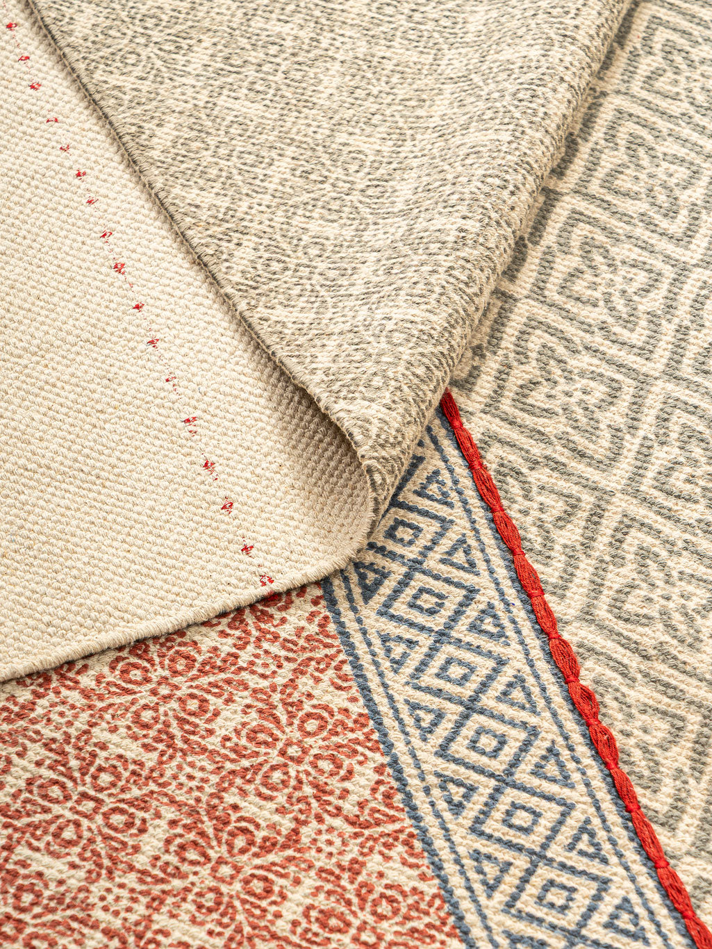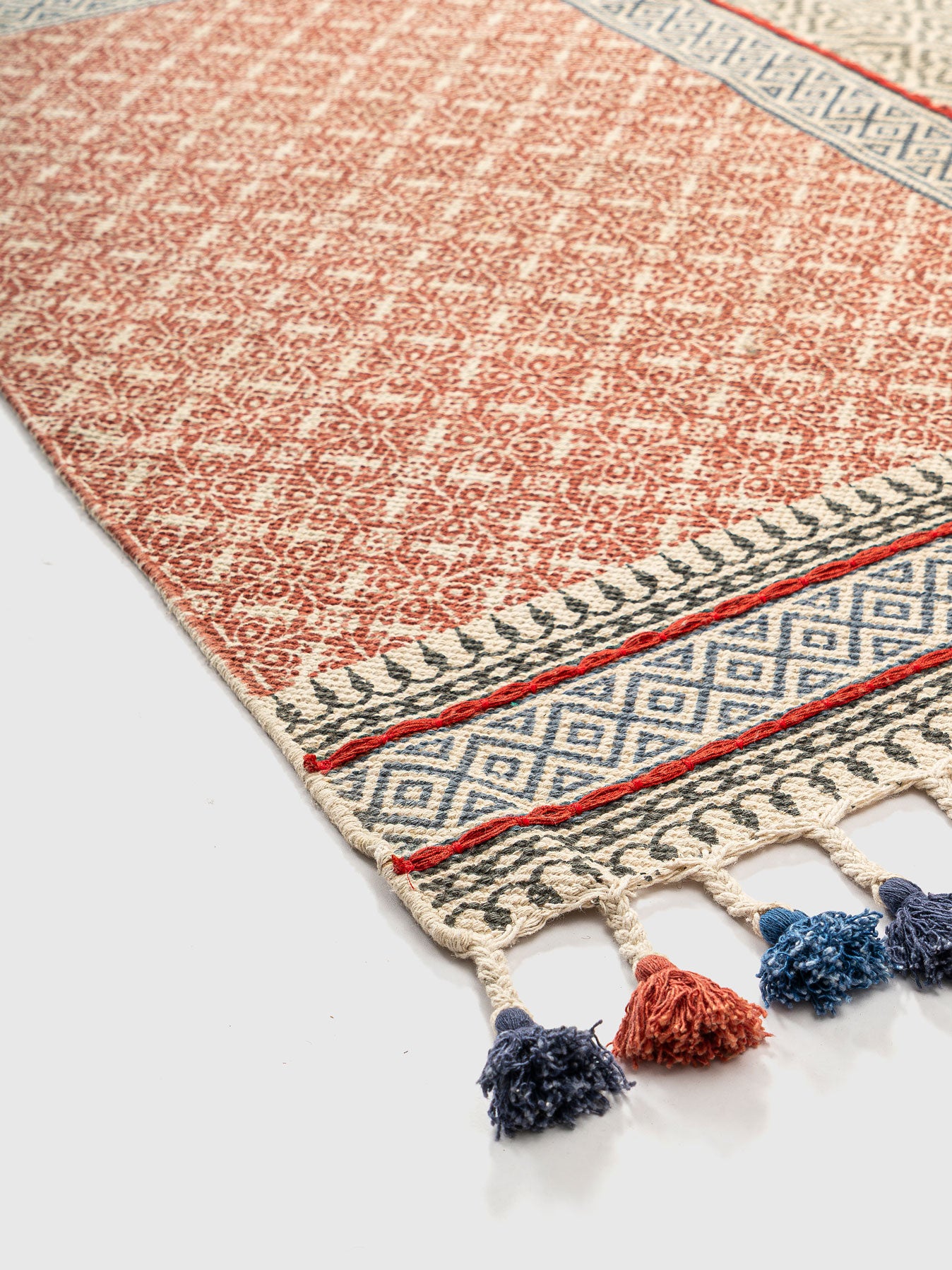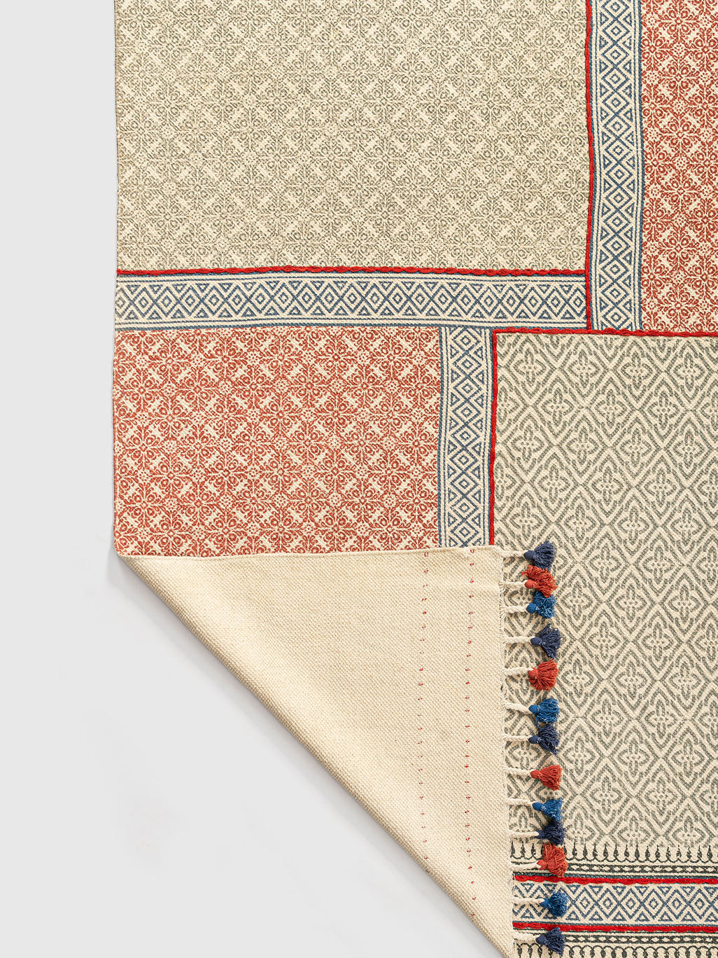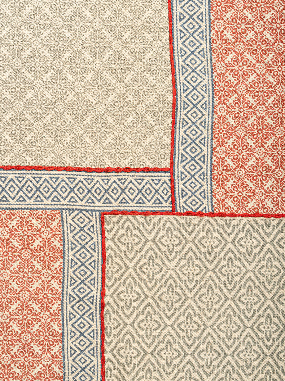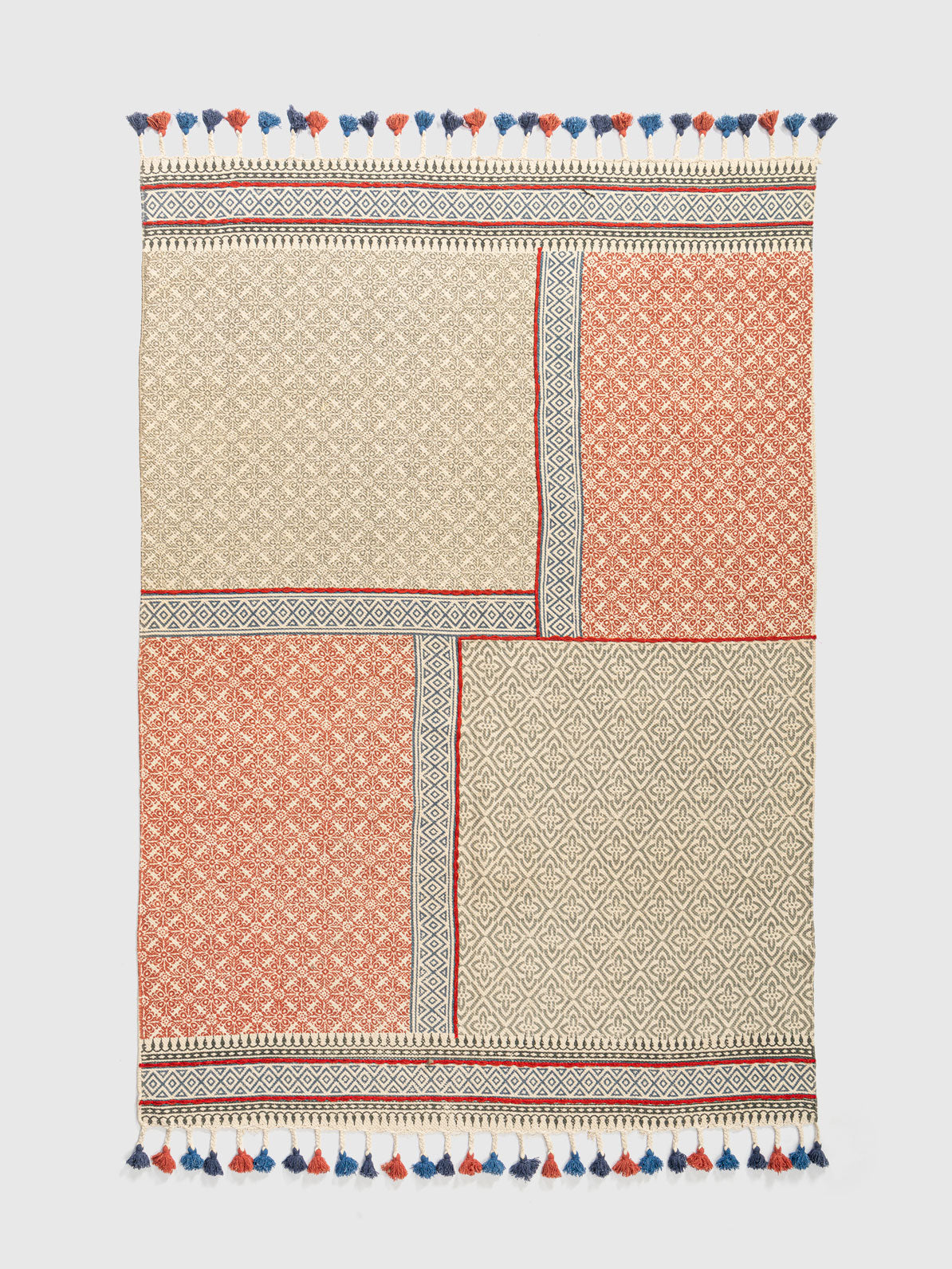 Add warmth and texture to your interiors with the Bamenmo Cotton Printed Rug. Its patchwork layout of red and beige patterned blocks creates a striking design, enhanced by borders and colorful tassels. Crafted from cotton, this rug is lightweight, eco-friendly, and soft underfoot. A versatile addition to living rooms, bedrooms, or lounge areas, it complements traditional and modern spaces with effortless style and comfort.