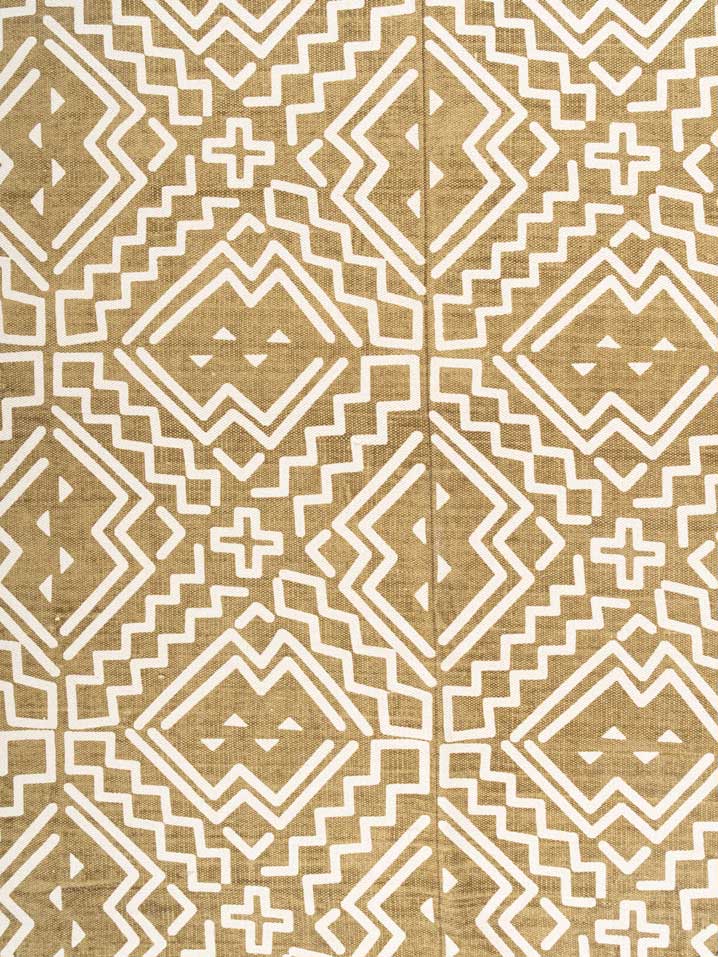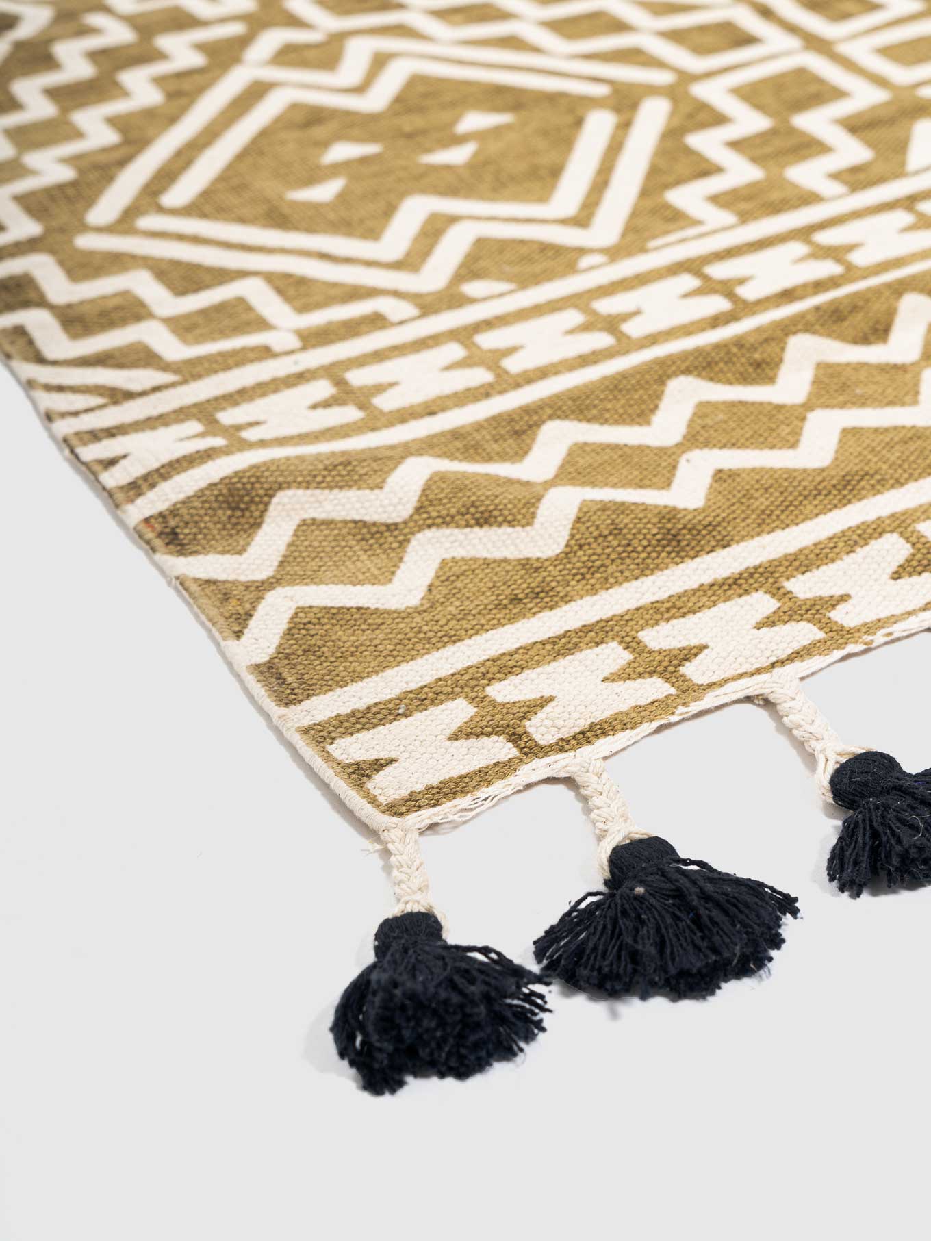 Guelma Cotton Rug showcases a striking geometric pattern in mustard yellow and white The edges are adorned with intricate border designs and finished with black tassels, adding a playful touch. This vibrant and bold rug would be a standout piece in any room.