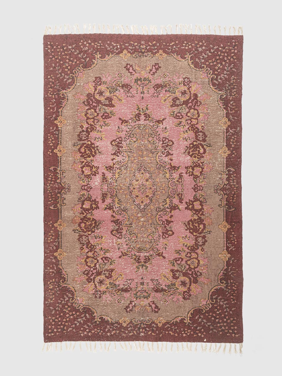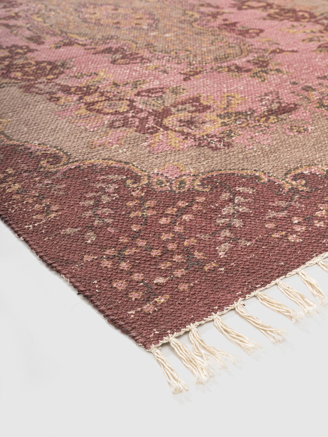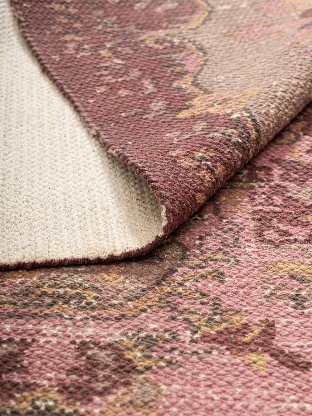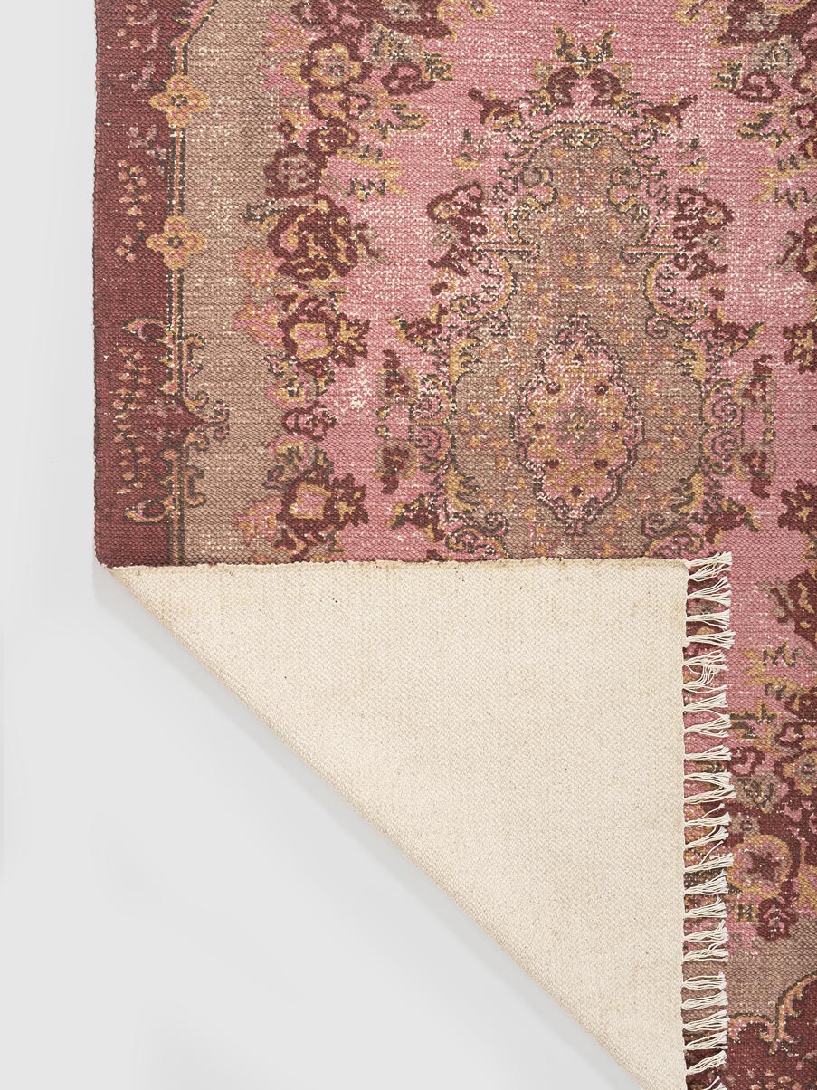 This elegant cotton printed rug features a vintage-inspired medallion design in soft pink, beige, and rich maroon tones. Crafted from high-quality cotton, it adds a charming, timeless feel to living rooms, bedrooms, or reading nooks. Perfect for traditional, boho, or eclectic interiors seeking warmth, character, and effortless style.