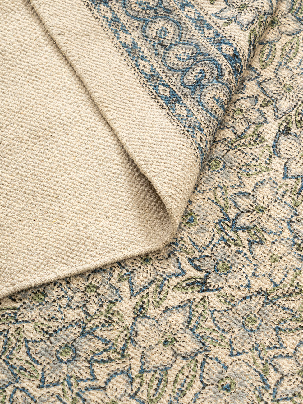 The Tajoog Cotton Printed Rug is designed for lovers of subtle beauty. Its all-over floral pattern in soothing blue and cream tones creates a calming aesthetic, complemented by a decorative border and fringed edges. Made from pure cotton, it’s soft underfoot and durable for daily use. This rug is perfect for enhancing modern, rustic, or traditional spaces with warmth and timeless elegance.