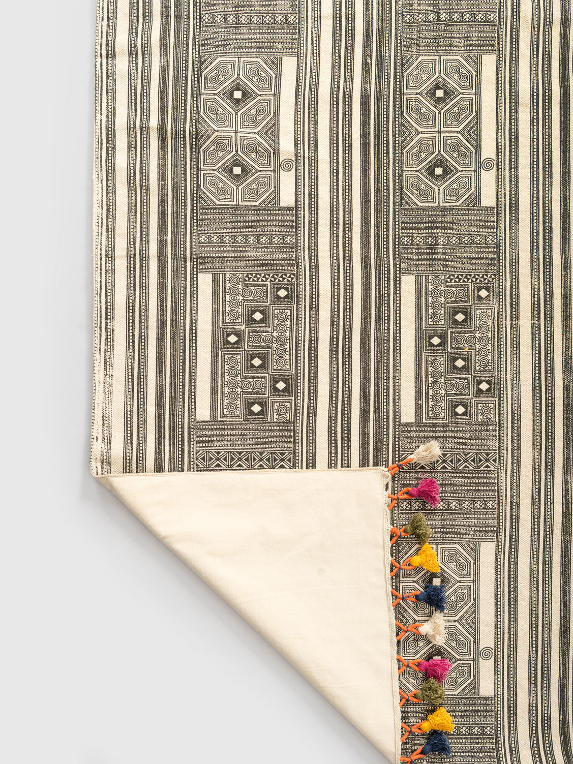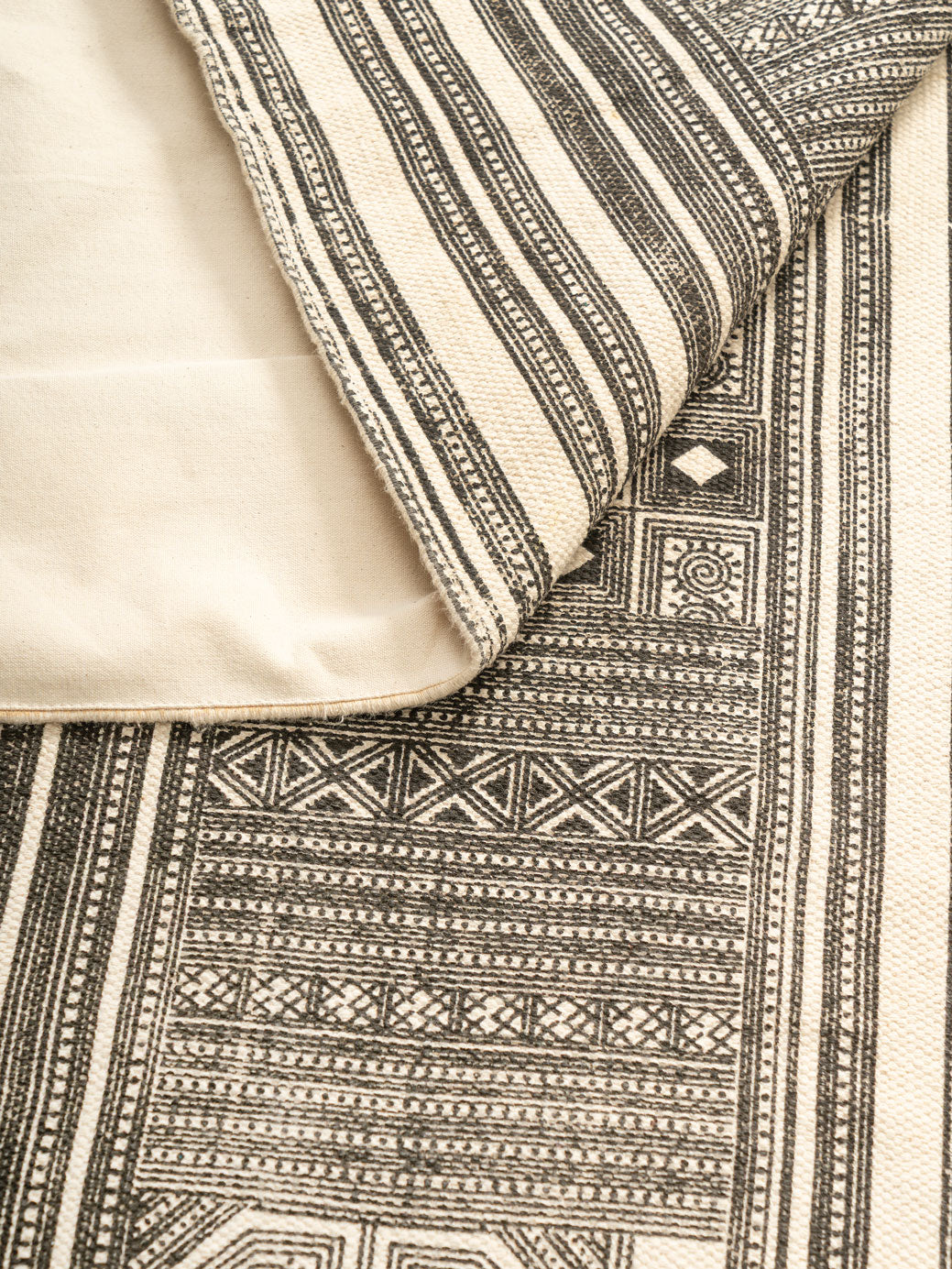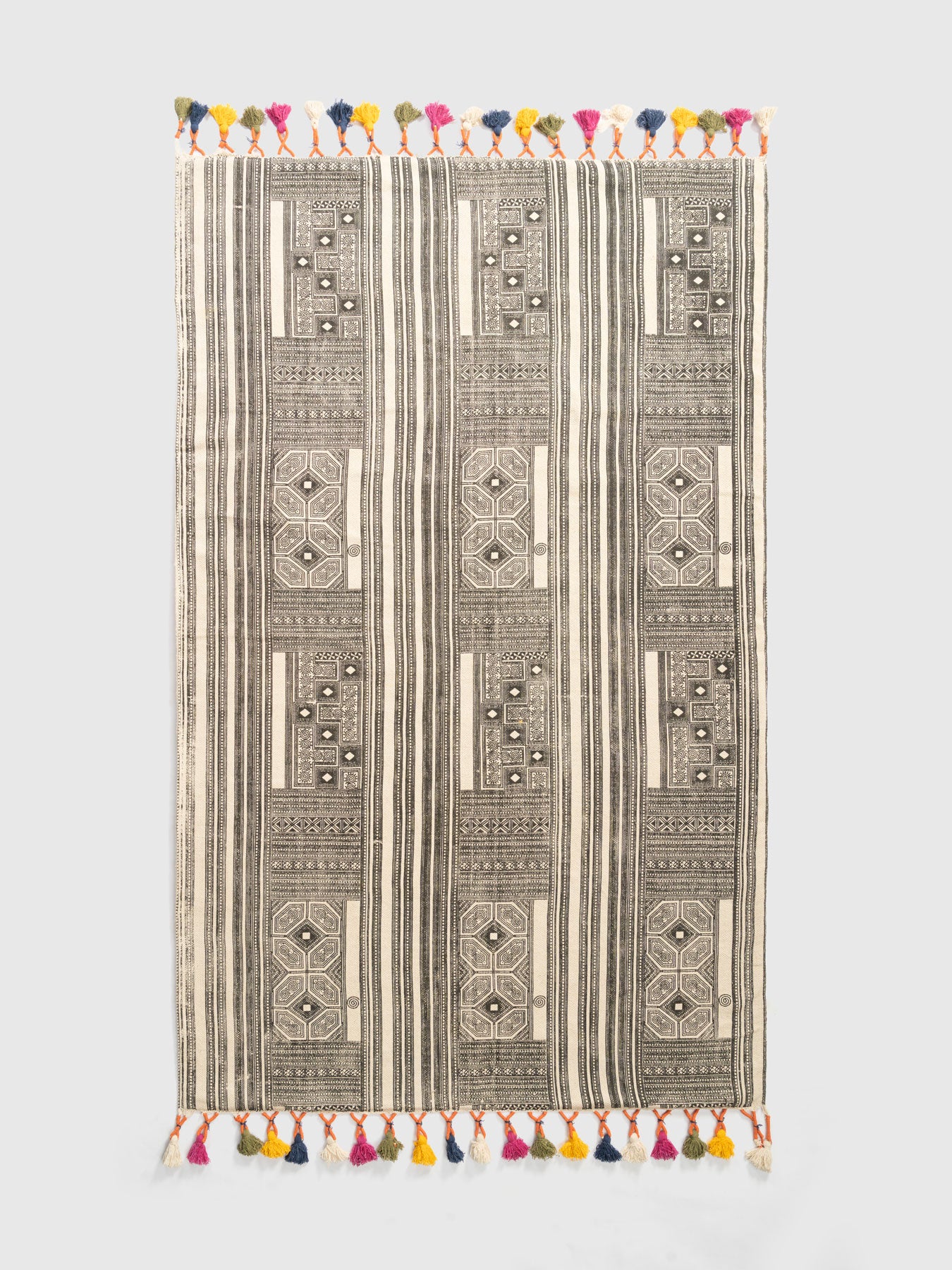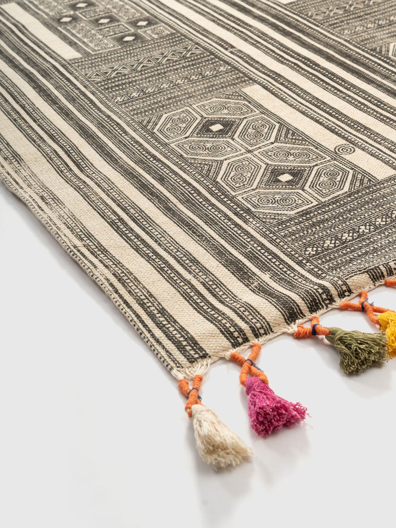 The Toribari Cotton Printed Rug is a striking blend of tradition and modern flair. Featuring bold black-and-cream patterns with tribal-inspired motifs, its design is elevated with colorful tassels that bring a playful accent. Crafted from soft, durable cotton, this rug is lightweight, breathable, and easy to maintain. Perfect for eclectic, bohemian, or modern homes, it adds both character and comfort to your living spaces.