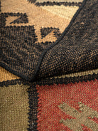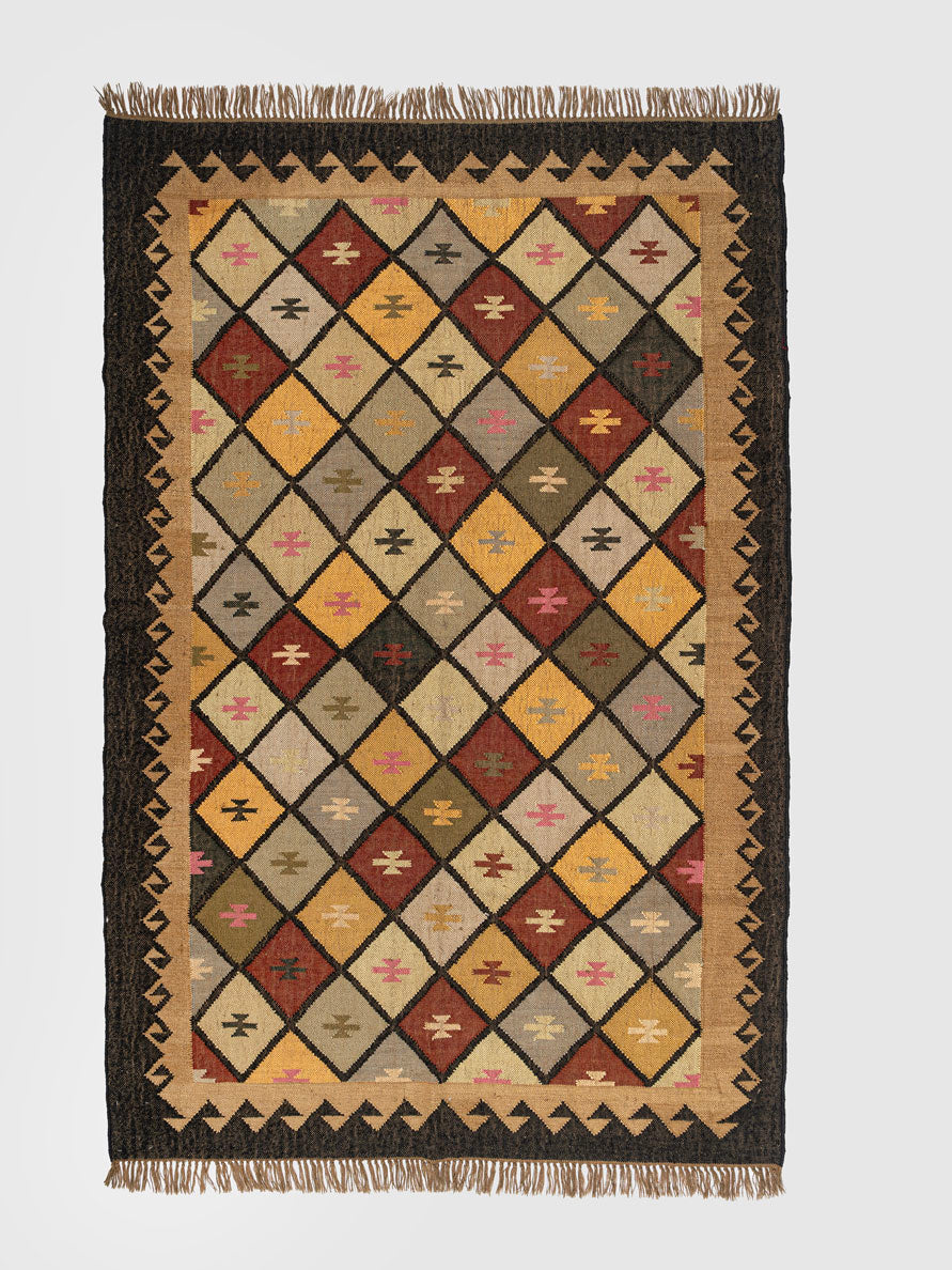 Pinsk Wool Rug showcases a vibrant diamond pattern in earthy reds, yellows, greens, and beiges, each diamond containing intricate geometric motifs. Bordered by a dark zigzag frame and finished with fringes on the shorter sides, it adds a traditional, cozy touch to any room.