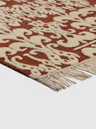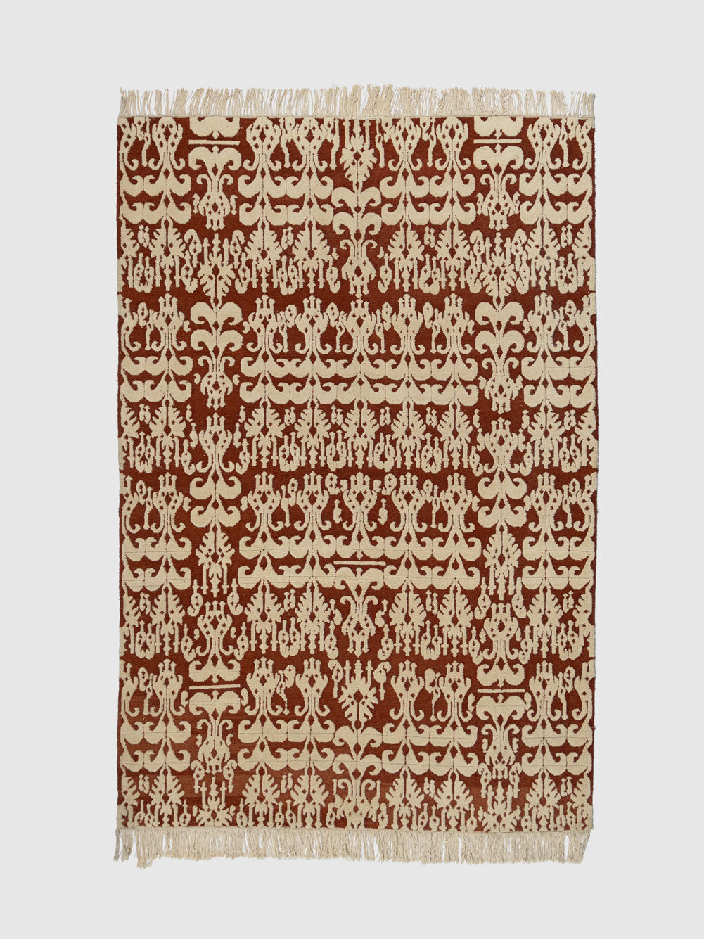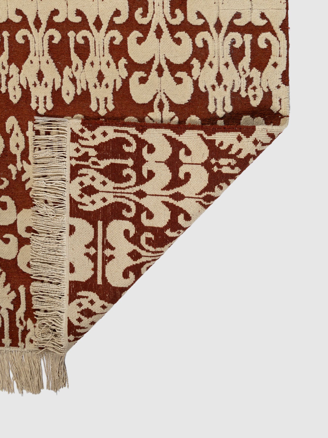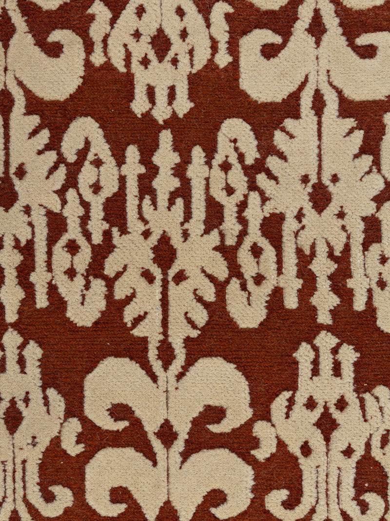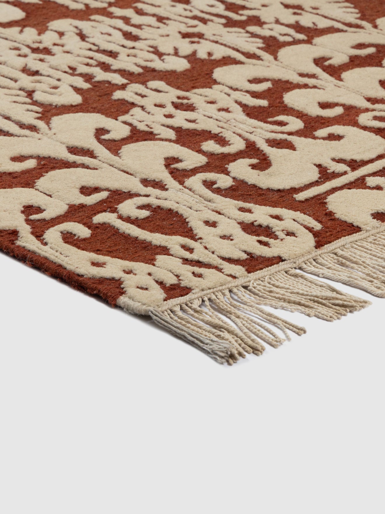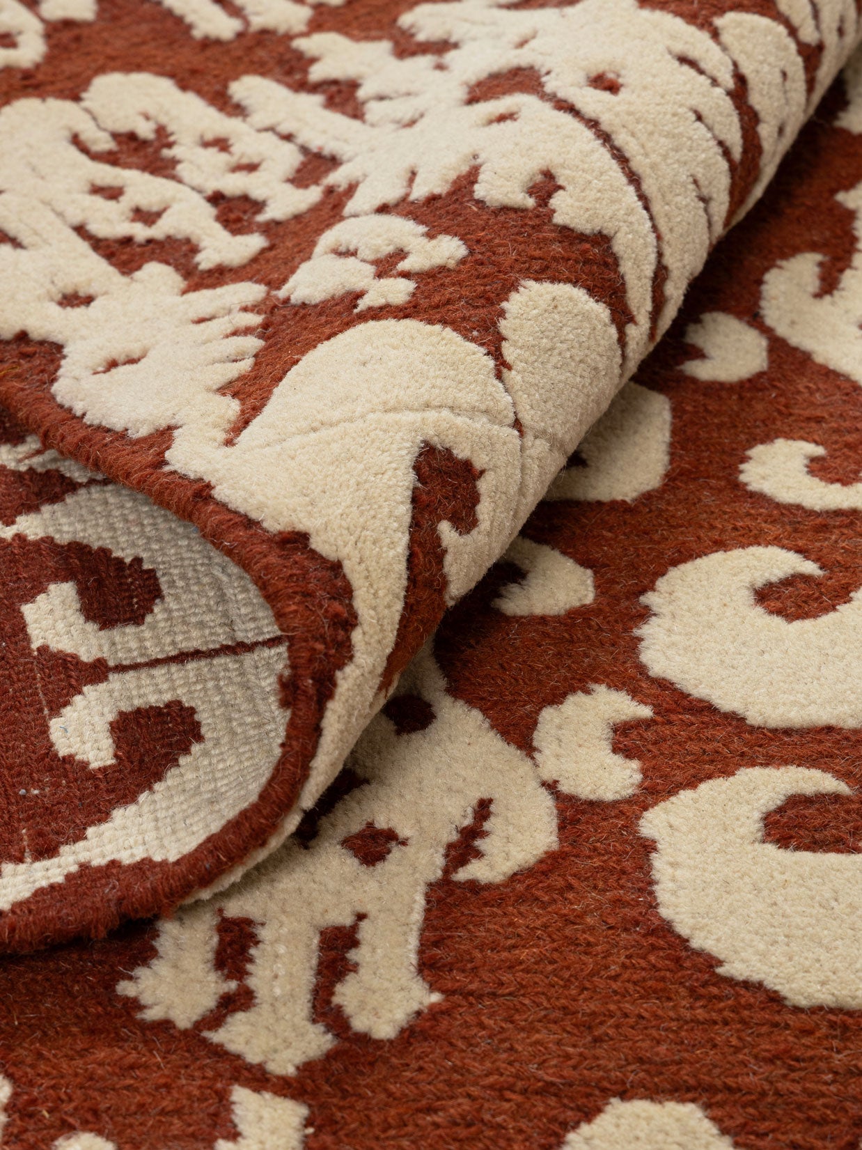 Introduce striking artistry and timeless craftsmanship into your home with the Sicily Wool Knotted Carpet, a hand knotted rug that pairs bold colour with intricate pattern work. Its warm terracotta base is beautifully contrasted by cream motifs arranged in rhythmic bands, creating a design that feels both traditional and refreshingly modern. The pattern appears almost carved into the wool, adding sculptural texture and visual depth to the rug.