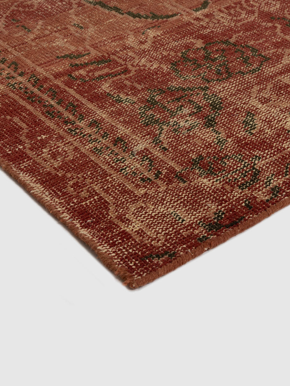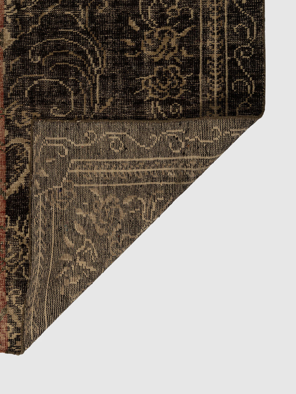 Each panel carries faint, beautifully distressed patterns that echo classic rug designs, giving the piece depth, texture, and a sense of lived-in authenticity. Hand-knotted using premium wool, the carpet offers a plush, resilient feel underfoot and long-lasting performance suited for everyday living.