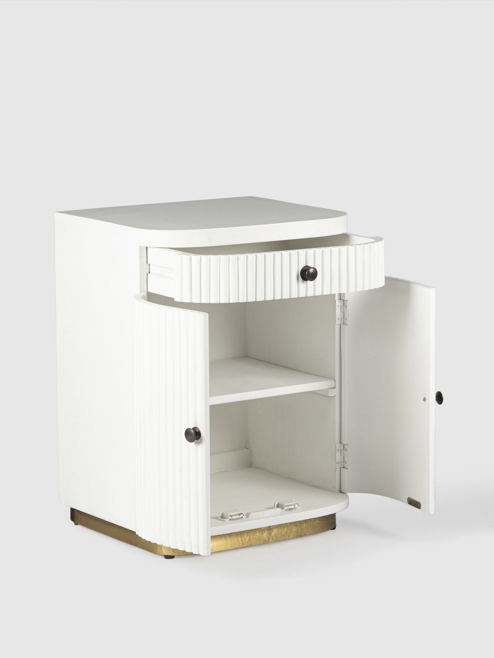 A chic, modern cabinet with a fluted white exterior, a single drawer, and double-door storage. Gold accents on the knobs and base add elegance. Ideal for bedrooms or living spaces, it blends sophistication and functionality, offering ample storage while elevating your interior with timeless charm.
