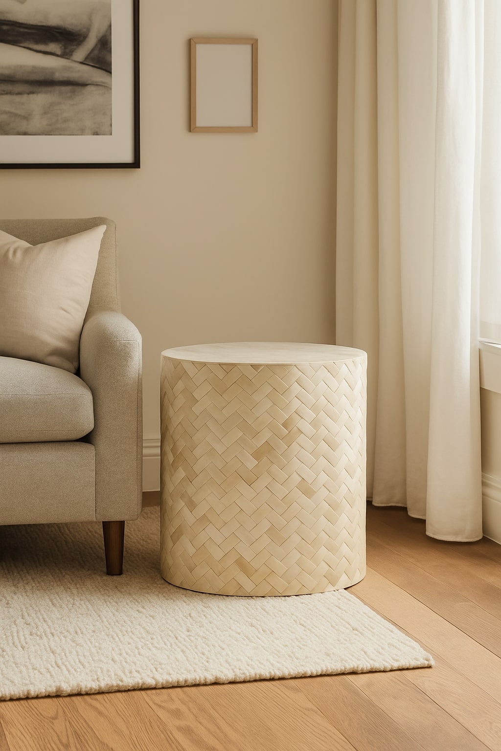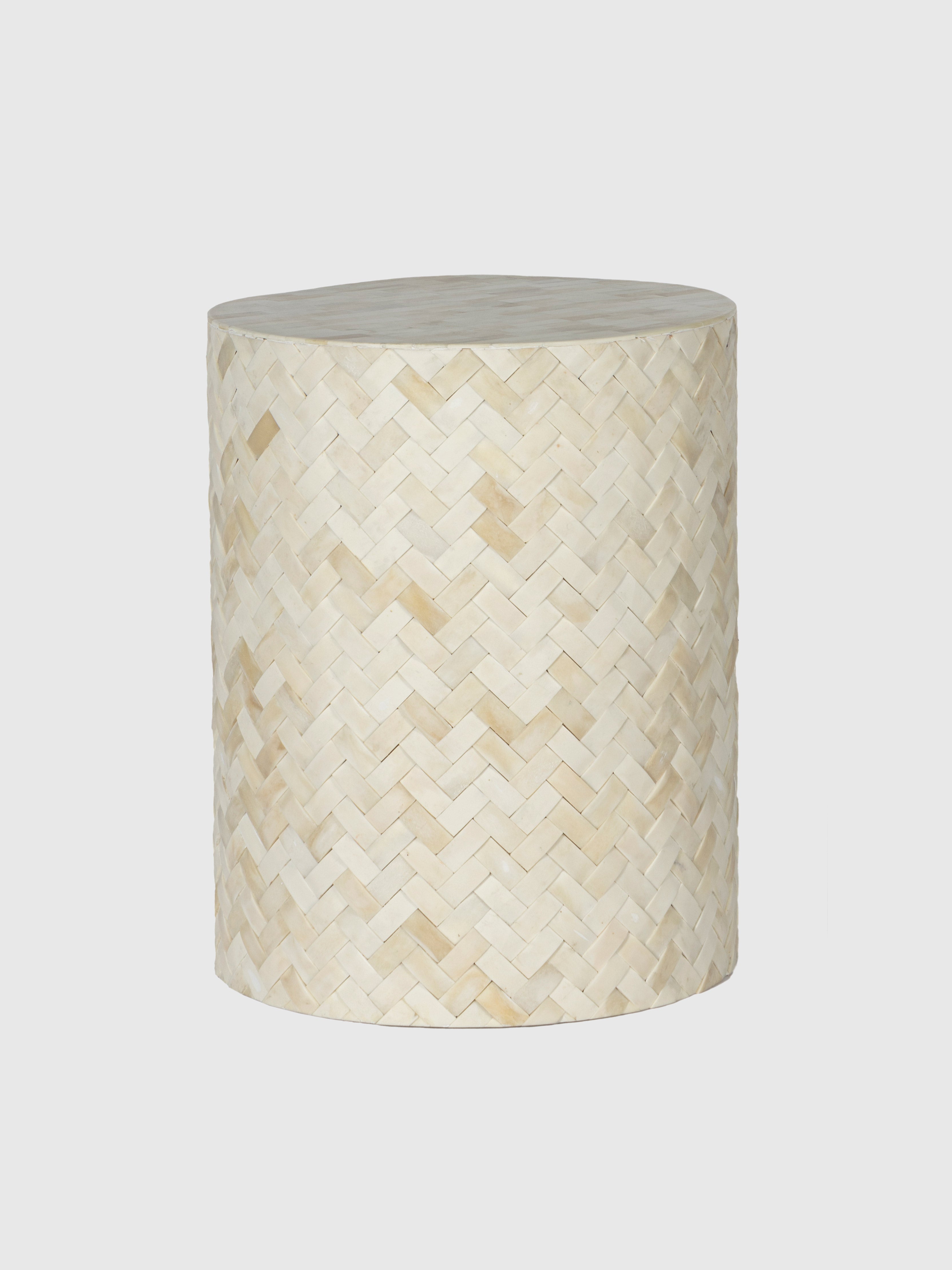 Elevate your interiors with this exquisite bone inlay herringbone side table, a timeless piece of artisanal craftsmanship. Each bone fragment is carefully hand-carved and inlaid to create a stunning herringbone pattern, radiating elegance and sophistication. Its cylindrical silhouette makes it a versatile addition — use it as a chic side table, a stylish stool, or even as a striking accent piece.