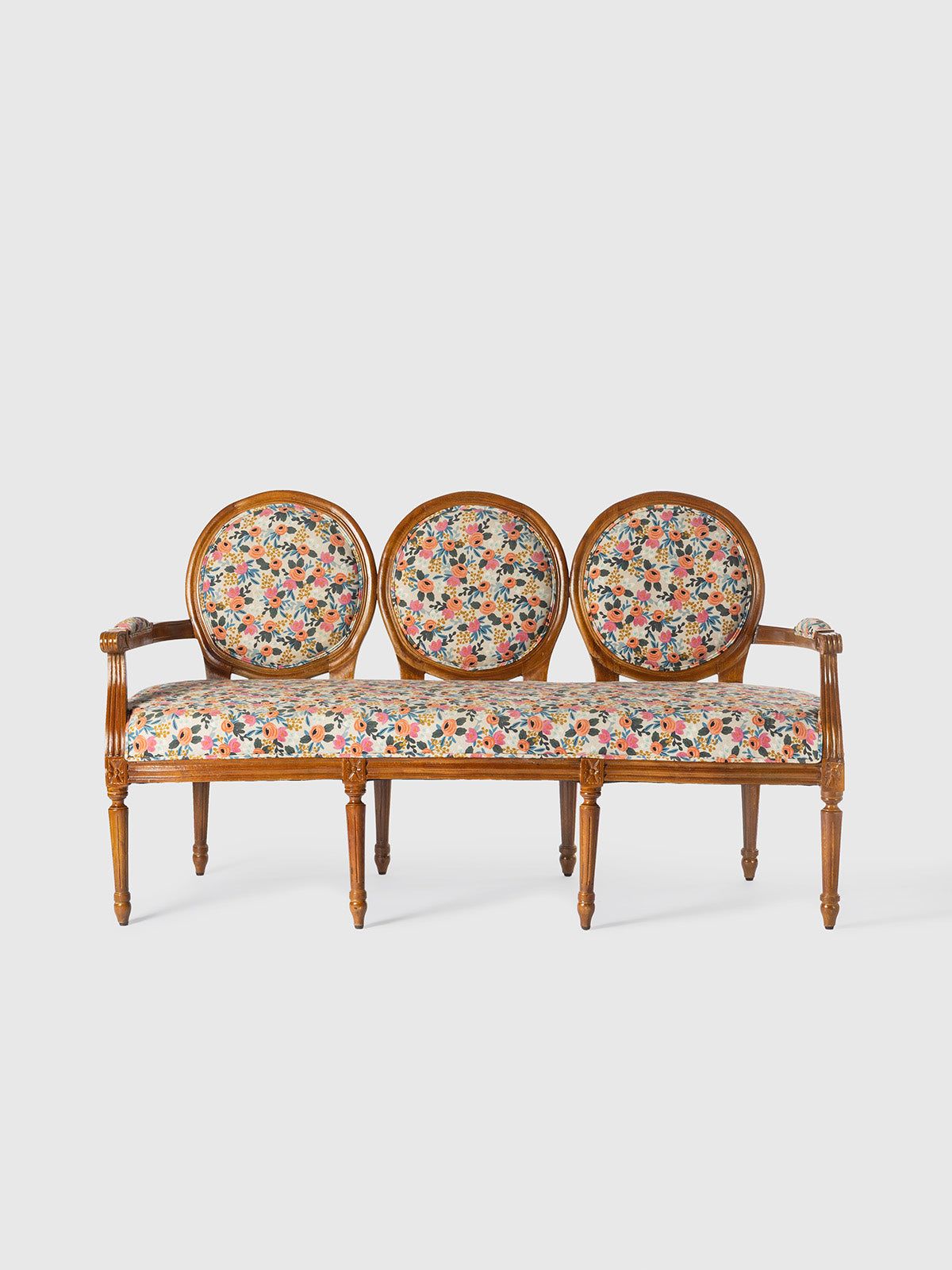 Whimsical and oh-so-charming! This floral upholstered settee adds vintage elegance with a playful twist. The triple oval backrest and warm wooden frame create a piece that’s both cozy and captivating. Add it to a hallway, reading nook, or dressing room—you’ll fall in love instantly.