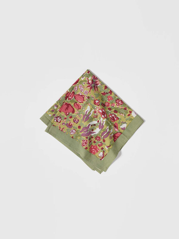 Introduce a burst of color to your table setting with the Basil napkin. This hand printed piece features vibrant red roses intermingled with lush greenery and smaller florals on a lively yellow background. It's perfect for spring gatherings or to brighten up any meal with its refreshing, floral charm.