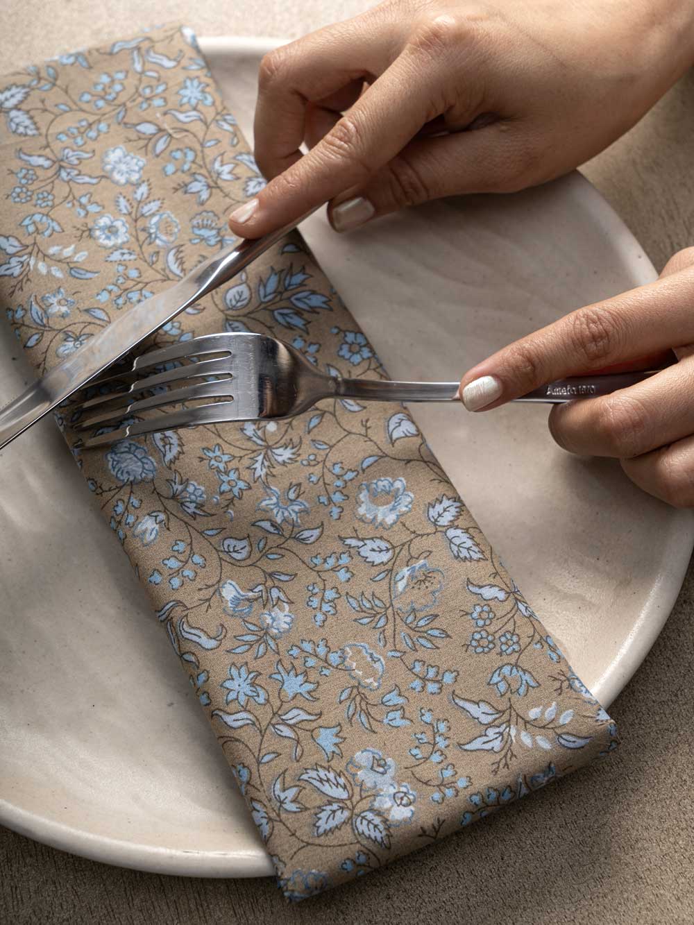 Enhance your dining experience with our 'Mulkoti' napkin, featuring a tasteful taupe base adorned with delicate blue floral accents. It combines understated elegance with practicality, ensuring it's as durable as it is beautiful. Perfect for everyday use, it's a stylish addition to the table setting.