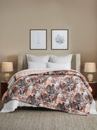 One side showcases a beautifully layered botanical pattern in muted blush, warm browns, and gentle neutrals, creating a calm yet expressive presence on your bed. The reverse shifts to a soft blush-pink solid, offering a minimal, serene look for days when you prefer simplicity and lightness. Soft, breathable, and richly textured through hand quilting, it promises year-round comfort with an elevated, heirloom-like finish.