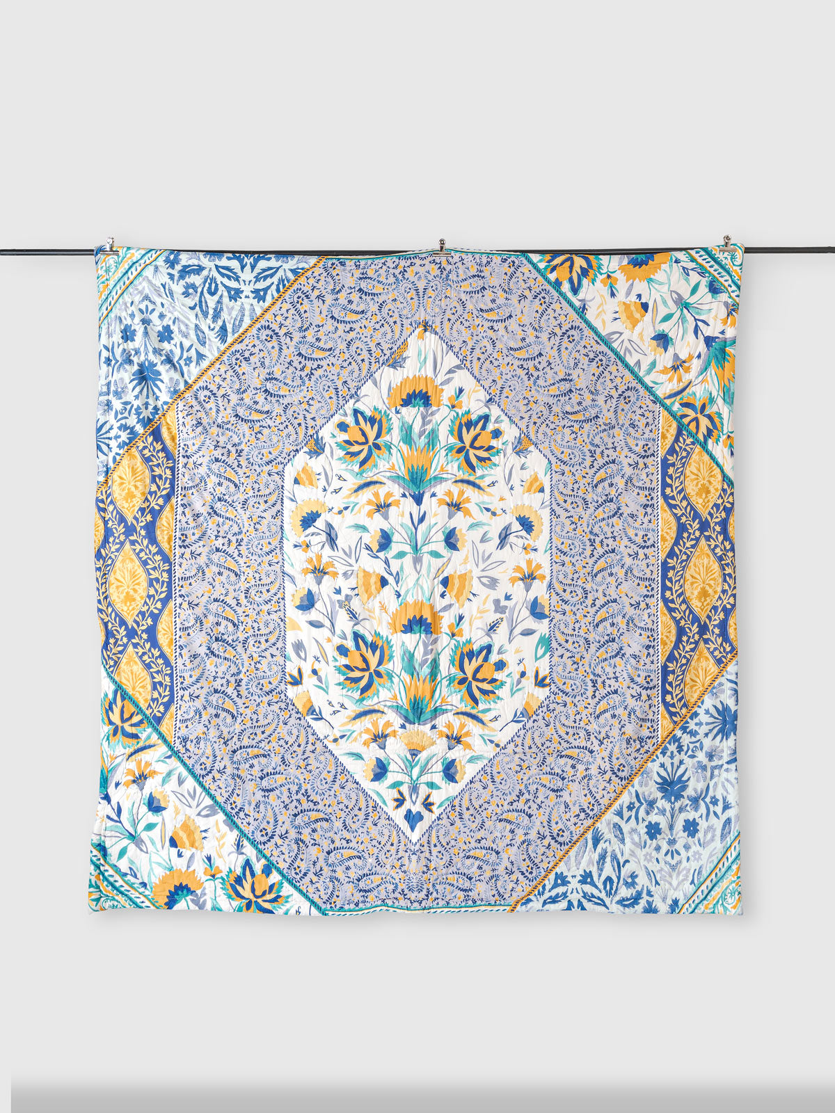 The Jaipur Darbar Printed Quilt evokes the grandeur of royal Rajasthan with its rich patterns, traditional motifs and opulent colour palette. Inspired by the artistry once seen in Jaipur’s royal courts, the quilt features an ornate central medallion framed by detailed floral vines and geometric borders in shades of indigo, mustard, emerald and ivory. The layered composition feels majestic and timeless, much like the palaces and havelis that influence its design.