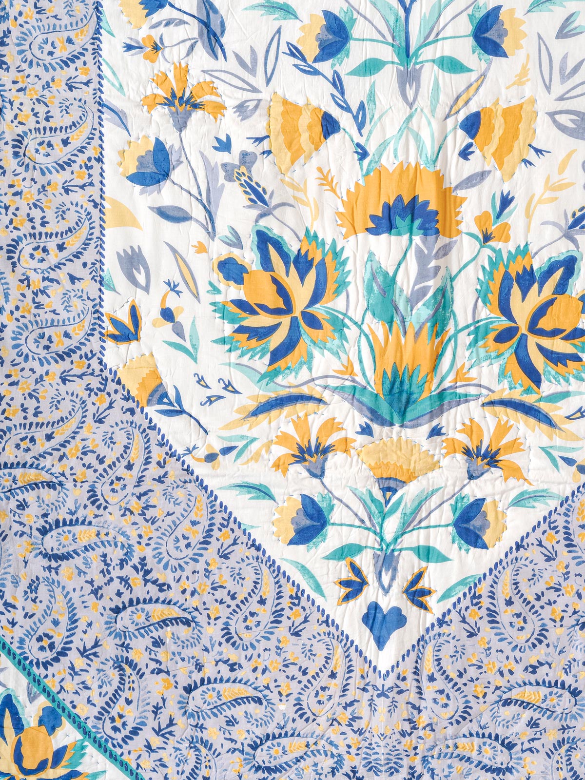 Every motif is printed by hand by skilled block printers who preserve the centuries-old craft through their careful workmanship. The quilt is then finished with fine hand quilting that creates a soft, breathable texture perfect for year-round comfort. The depth of colour, intricate detailing and harmonious layout make this quilt a standout piece for any home.