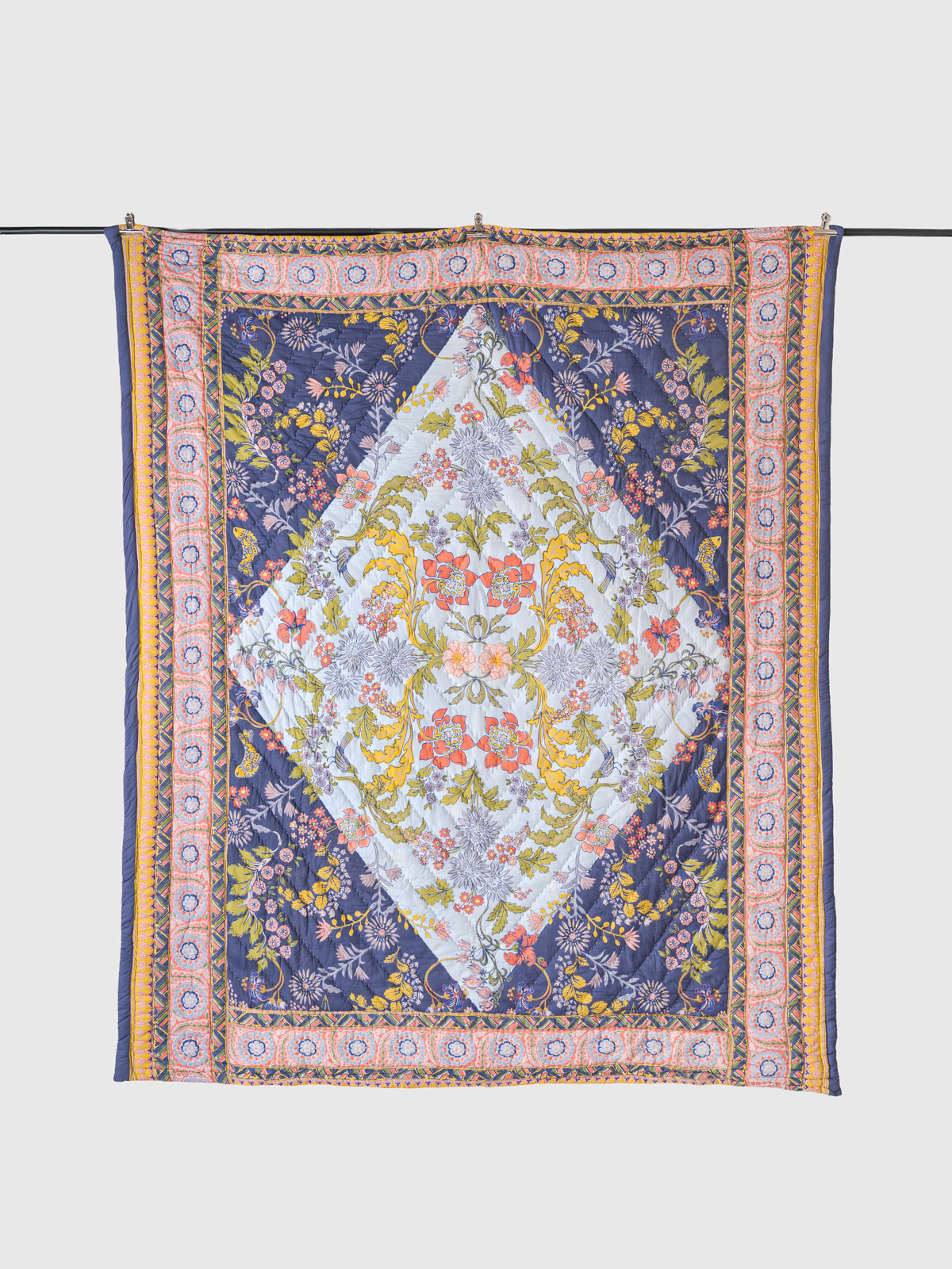 Each motif is printed by hand using age-old block printing techniques, giving the quilt its layered textures and rich character. Skilled artisans complete the piece with gentle hand quilting, allowing it to remain light, breathable and comfortable throughout the year. The interplay of dark tones with lively florals makes this quilt a true statement piece for any bedroom.