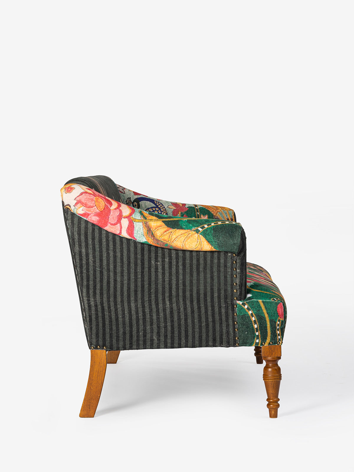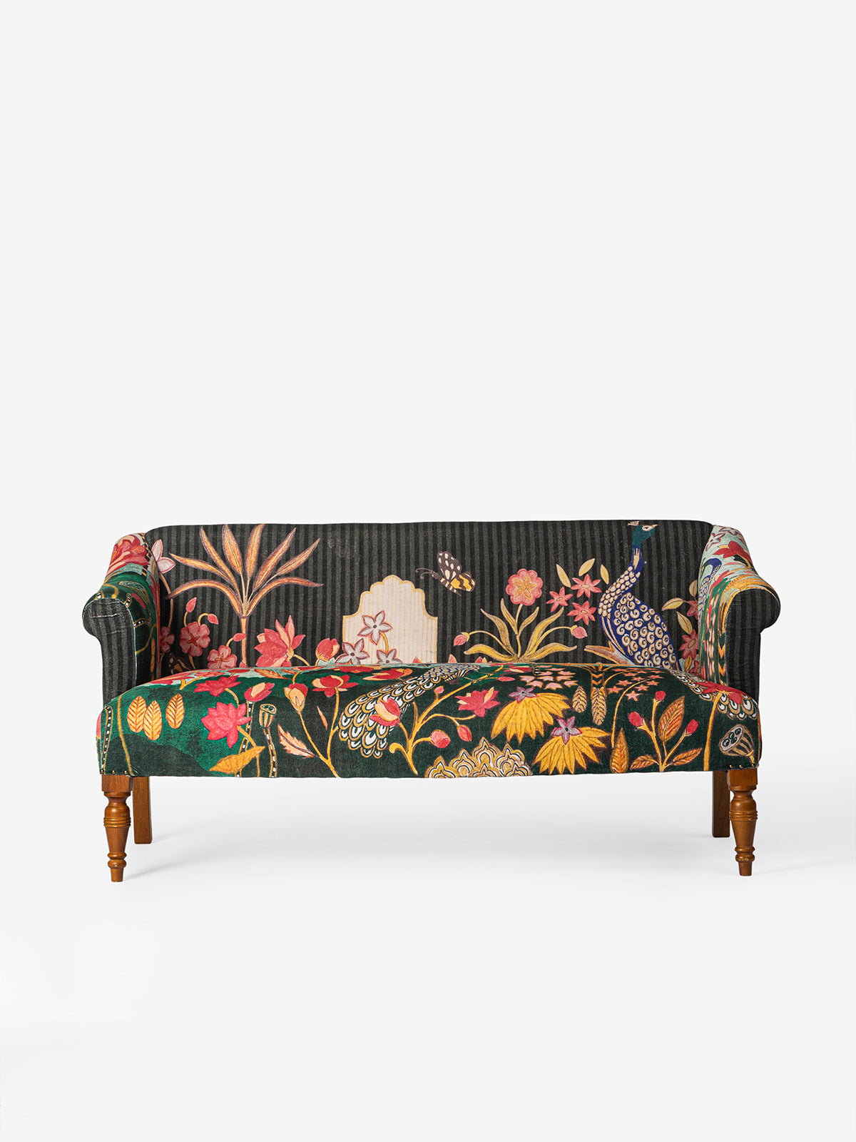This elegant sofa features a vibrant peacock and floral print on rich velvet fabric, complemented by classic turned wooden legs. Perfect for adding a touch of luxury and color to any living room or lounge area.
