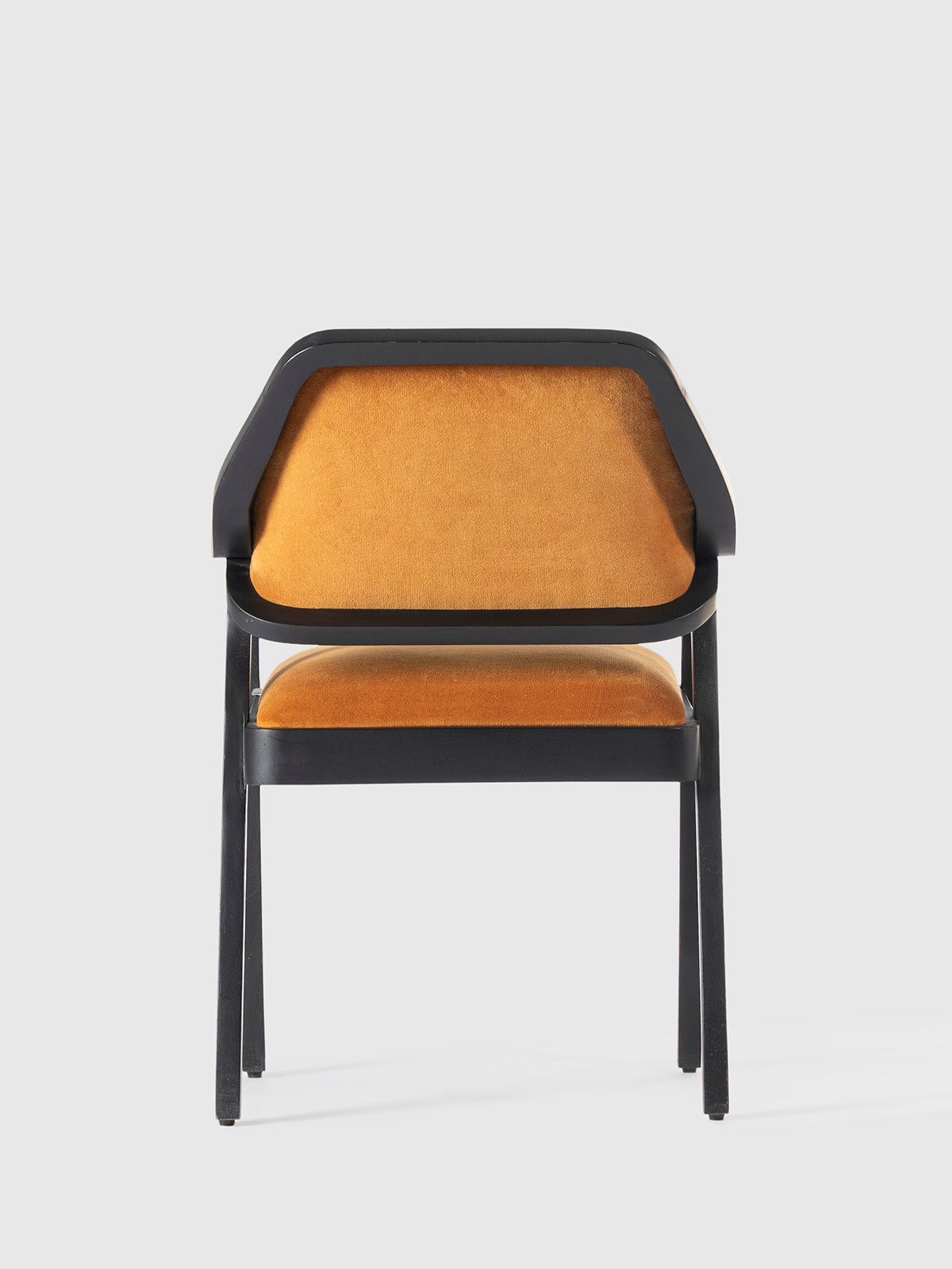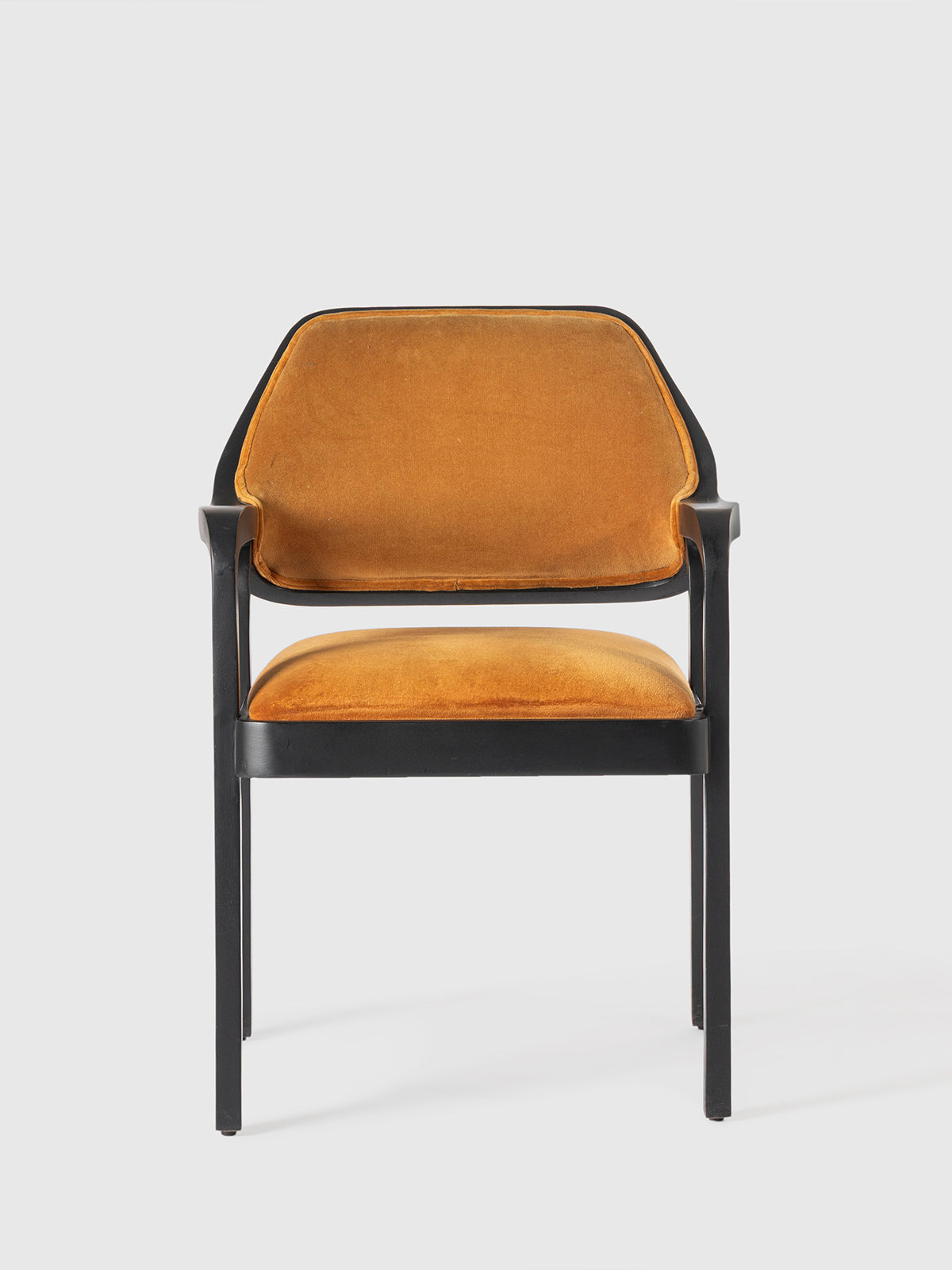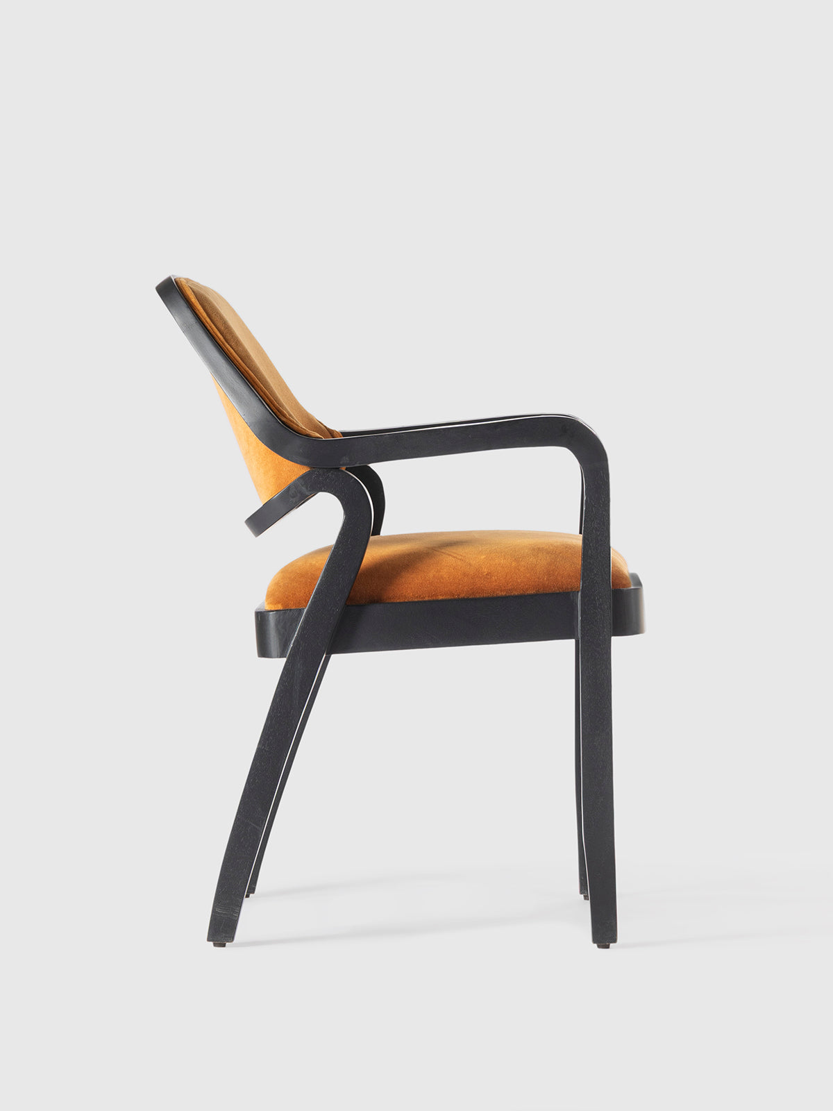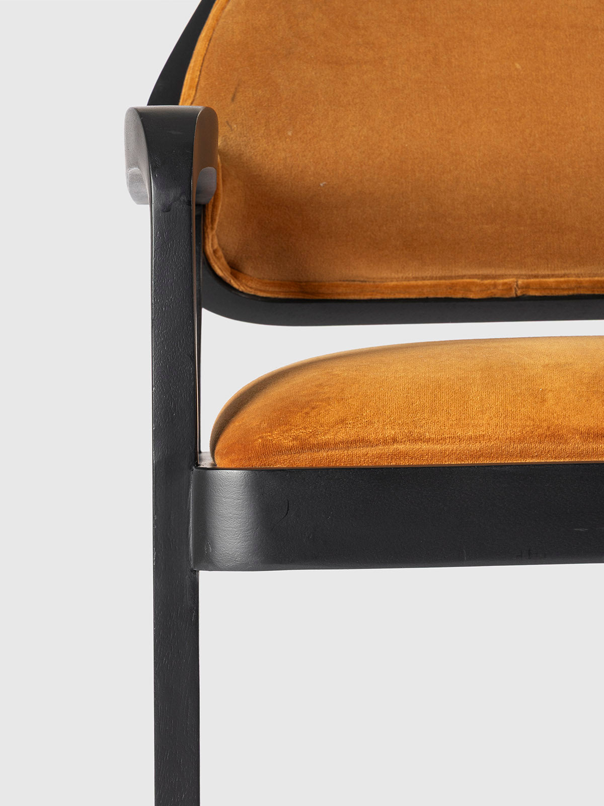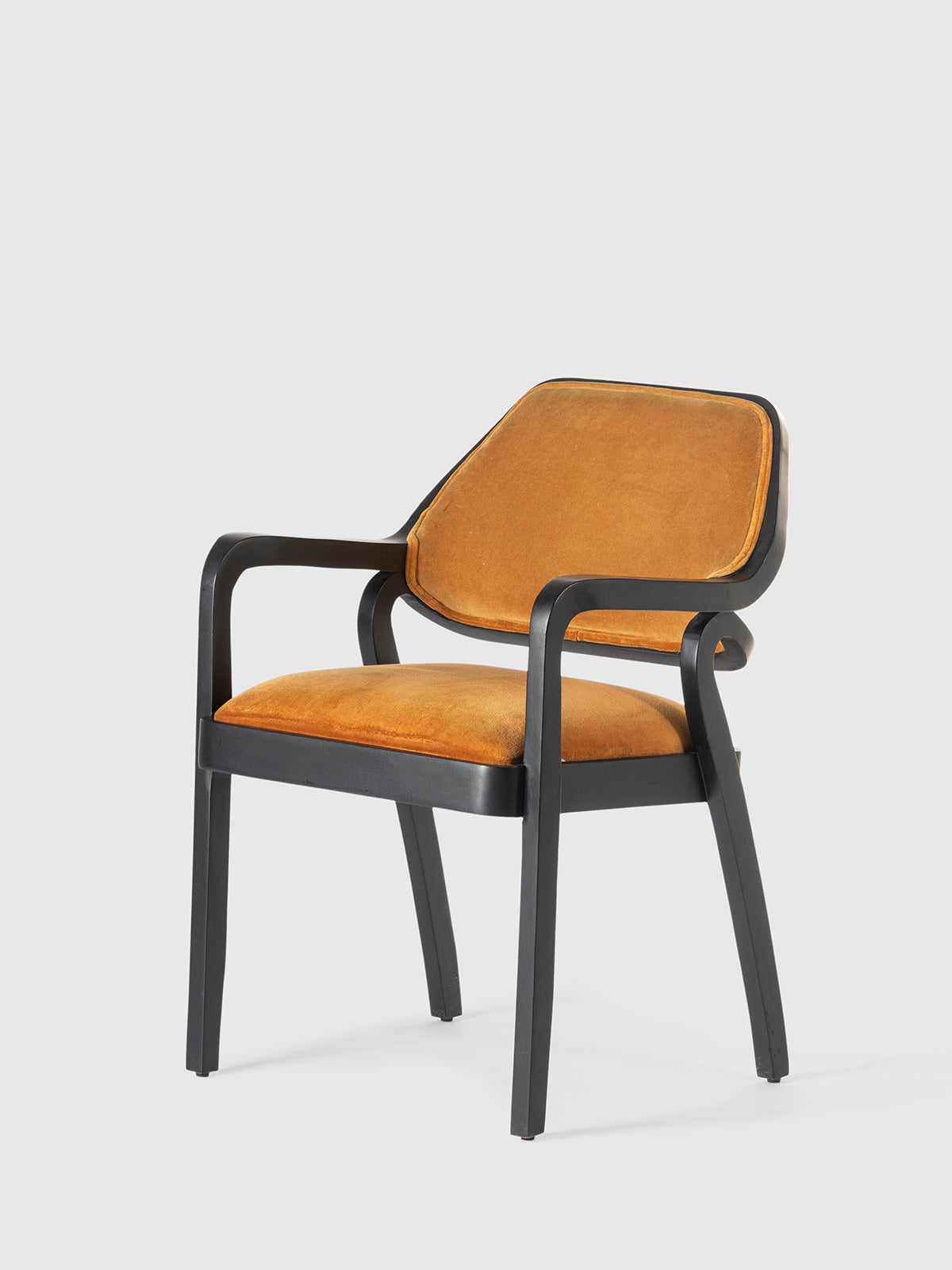 A sophisticated wooden armchair featuring a sleek black frame with elegantly curved armrests and plush velvet upholstery in a rich, warm hue. Designed for both comfort and style, this chair blends modern and vintage aesthetics, making it a perfect addition to dining spaces, offices, or statement seating areas.
