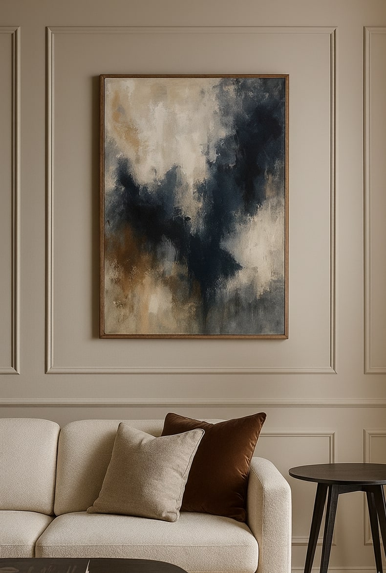 Depths of Being is an abstract journey into the unseen layers of existence, where deep indigos, earthy browns, and soft neutrals merge in a powerful composition. This printed canvas artwork reflects the harmony of contrast, symbolizing the balance between strength and vulnerability, mystery and clarity.